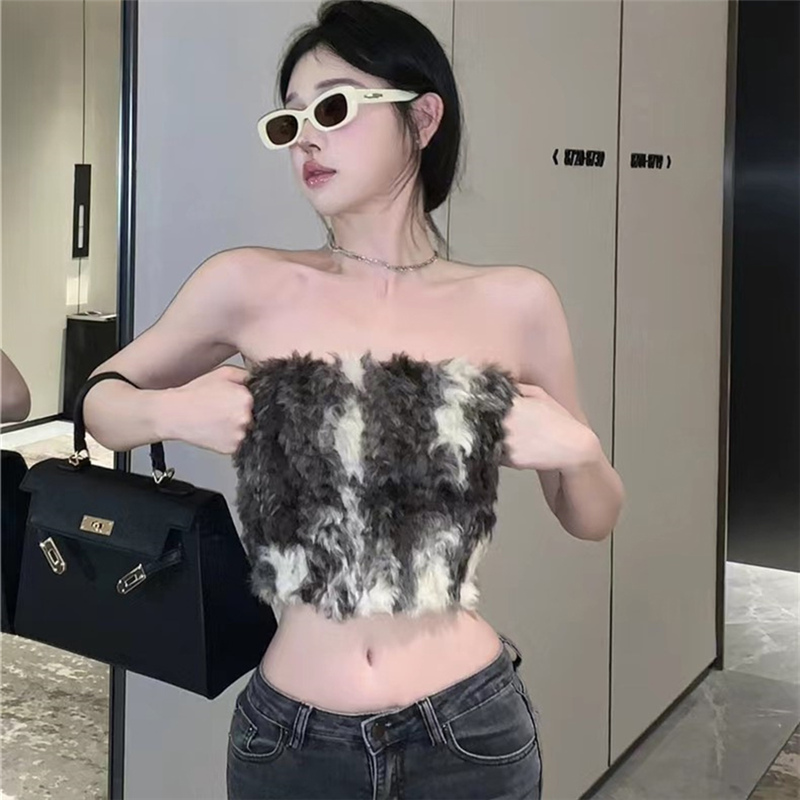 KLIOU 街头辣妹风软糯毛绒抹胸背心女内搭外穿显瘦高腰露脐短上衣