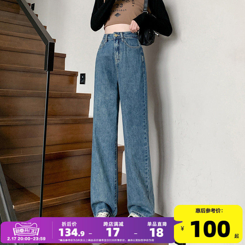 浅蓝色直筒牛仔裤女2024年春夏新款高腰宽松显瘦小个子阔腿拖地裤