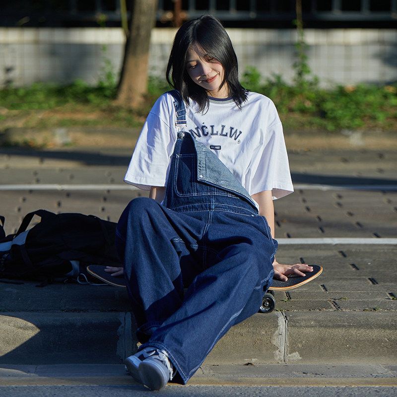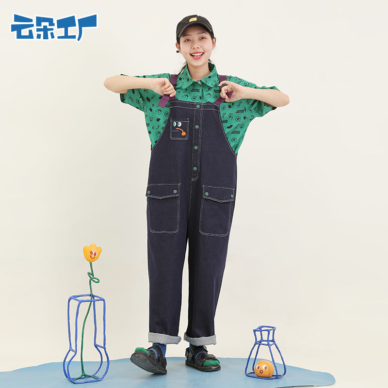 云朵工厂种子拼色牛仔背带裤夏季新款女宽松阔腿裤日系连体工装裤