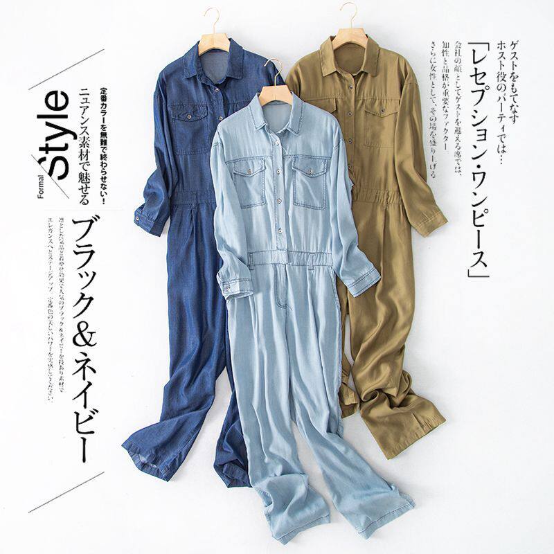 薄款天丝牛仔连体裤女春秋韩版工装高腰显瘦宽松夏季连体衣套装潮