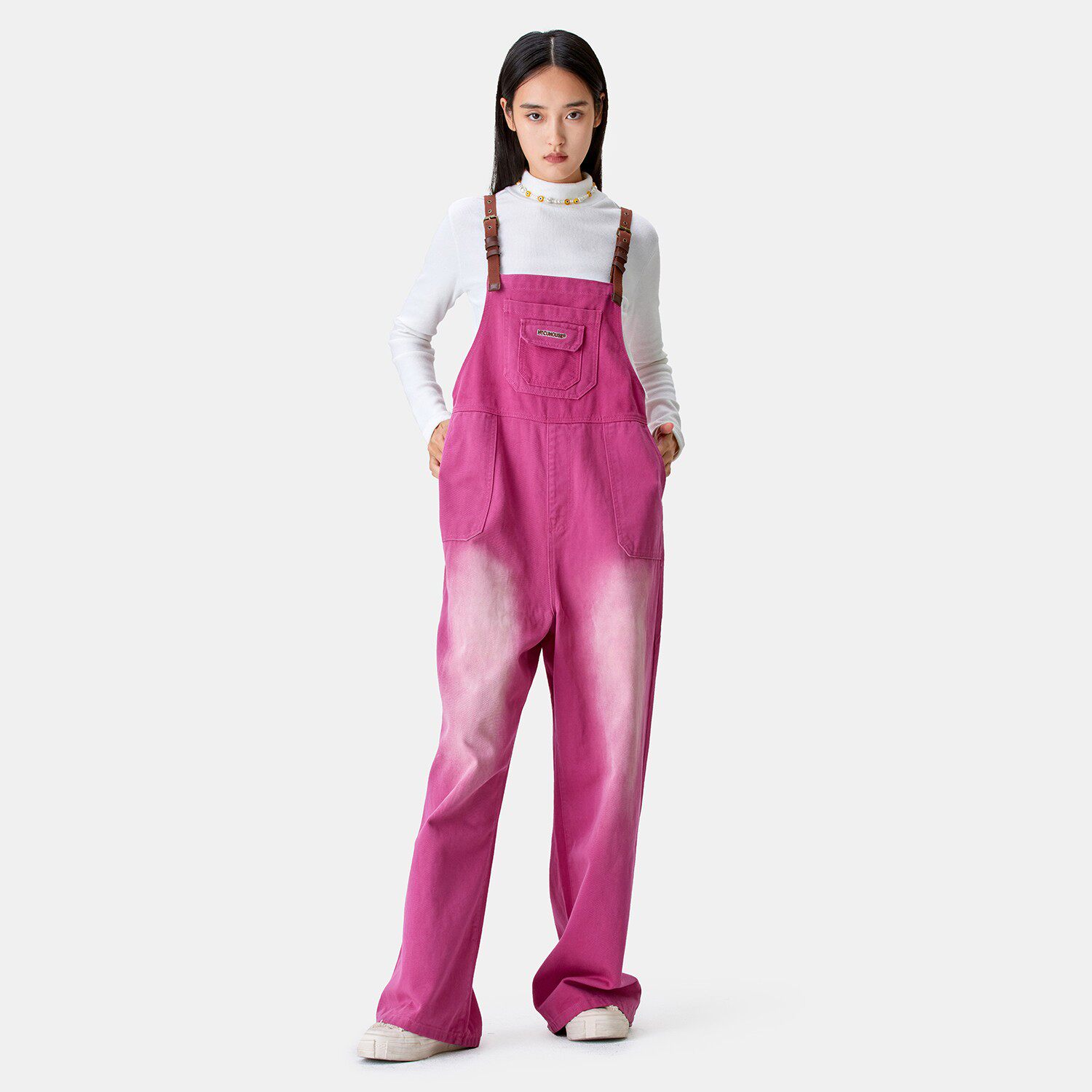 HTCU水洗做旧复古背带裤玫红色多巴胺男女情侣连体裤休闲裤牛仔裤