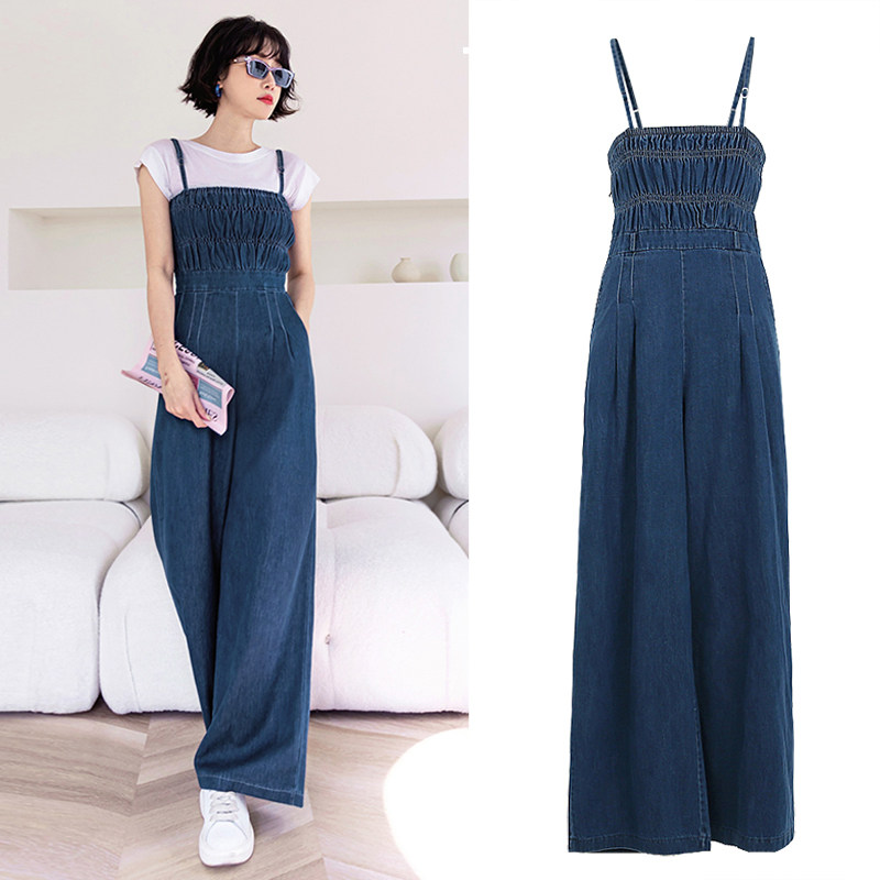 夏季复古深蓝新款韩国东大门休闲直筒抽绳收腰抗皱抹胸连体牛仔裤