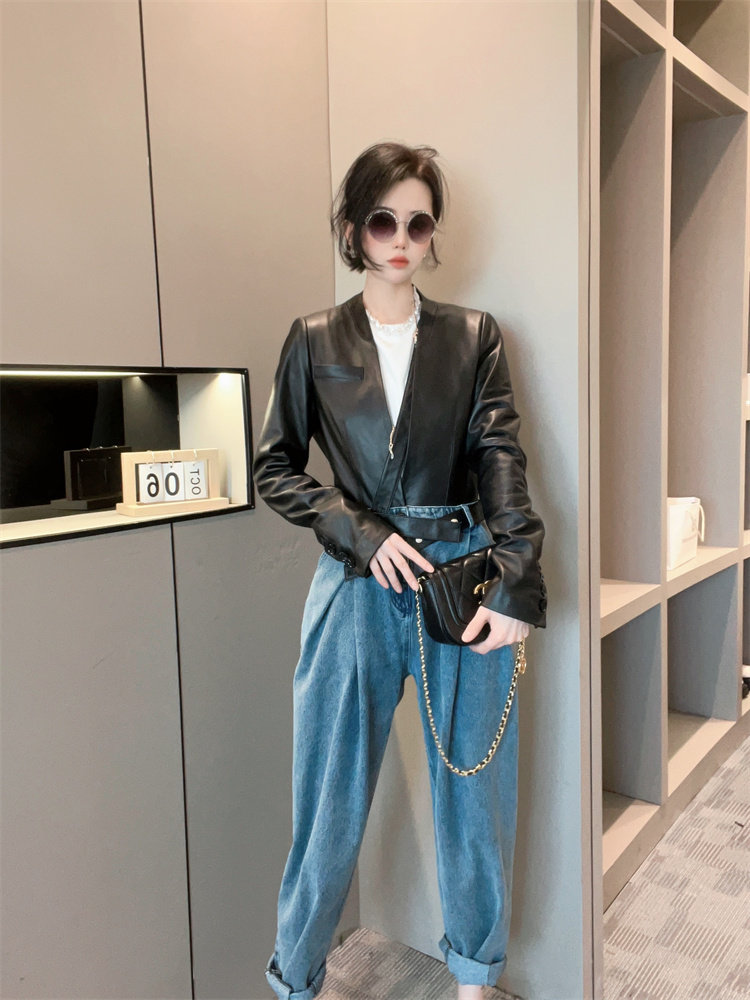 连体裤欧韩货长款平拼接牛仔绵羊皮皮衣欧洲站女装2023年春季新款