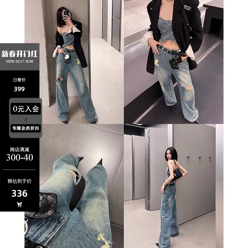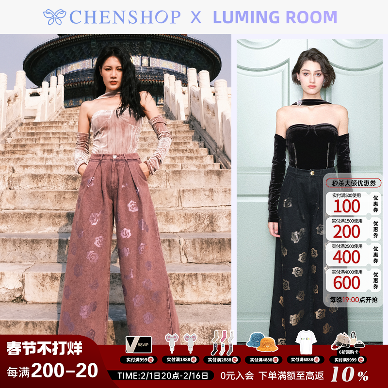 LUMING ROOM丝绒挂脖连体上衣烫金玫瑰印花牛仔裤CHENSHOP设计师