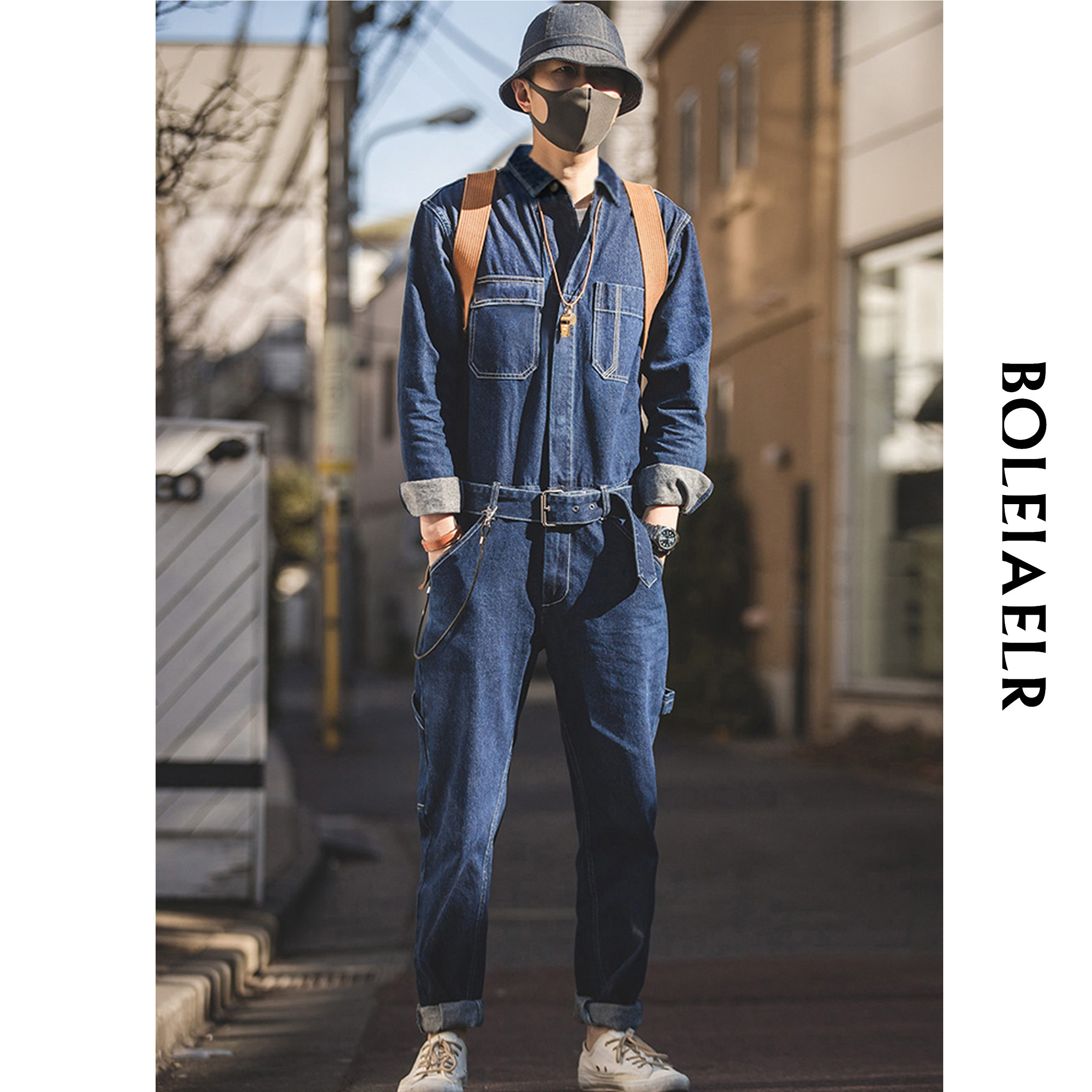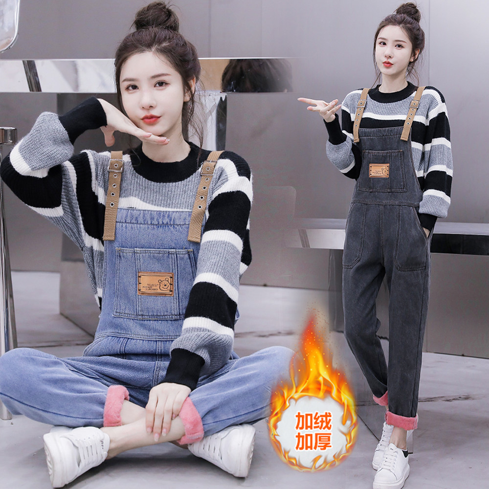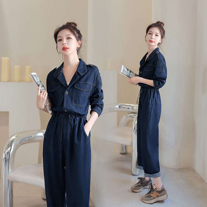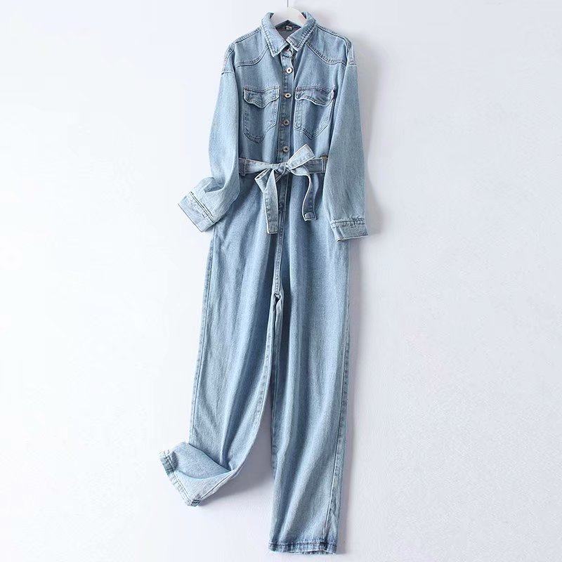 韩货牛仔连体裤套装女2020春新款宽松长袖韩版工装收腰直筒高腰潮
