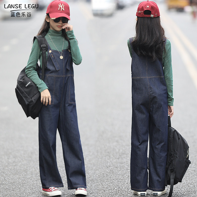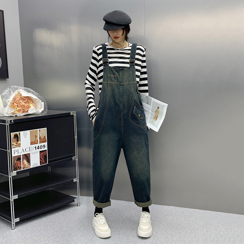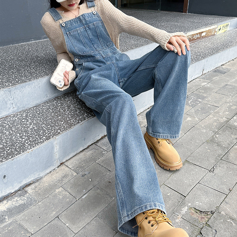 2023秋冬新款复古水洗牛仔背带裤女韩版宽松休闲显瘦连体阔腿长裤
