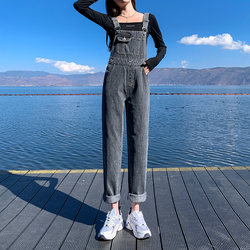 宽松男友风显瘦高腰背带牛仔裤女慵懒直筒连体长裤子烟灰色秋季新