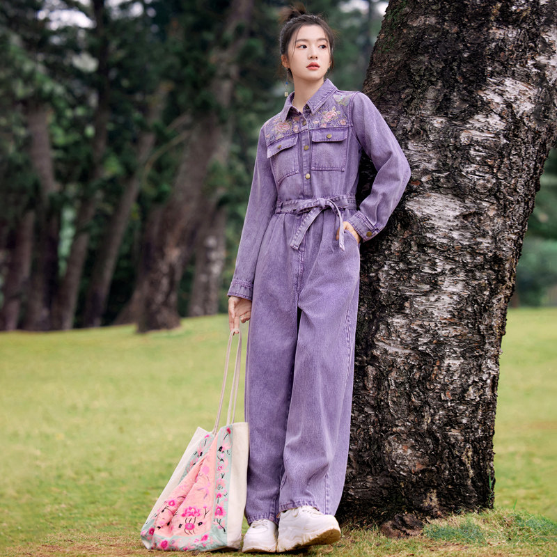 花制作 云风拂露贰 原创国风刺绣天丝牛仔连体裤女设计感宽松长裤
