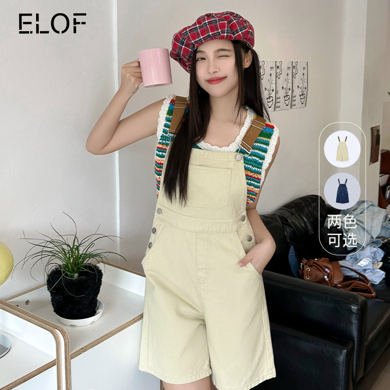 ELOF夏季薄款减龄气质牛仔背带裤女美式韩版连体短裤宽松休闲显瘦