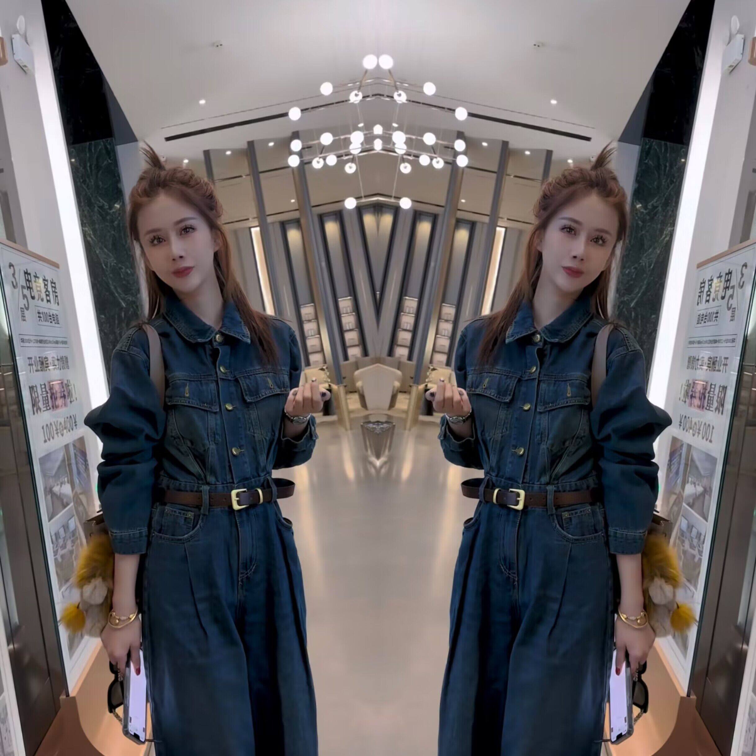 GS博主穿搭收腰显瘦复古牛仔连体裤女长袖气质POLO领A字短裤新款