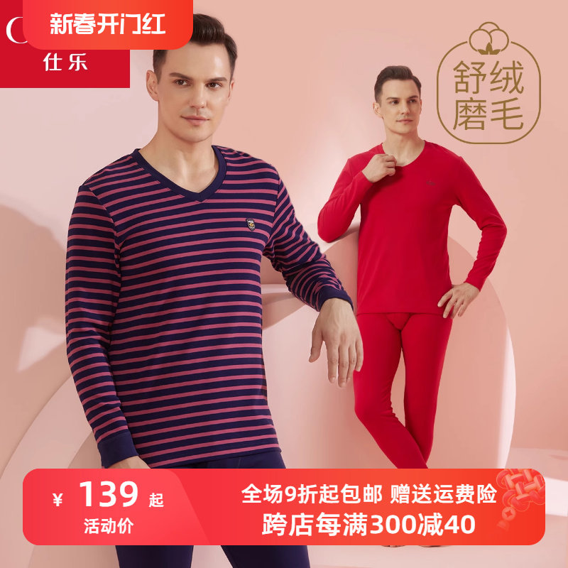 仕乐V领条纹男士舒绒秋衣秋裤套装大红打底毛衫线衣衬裤保暖内衣