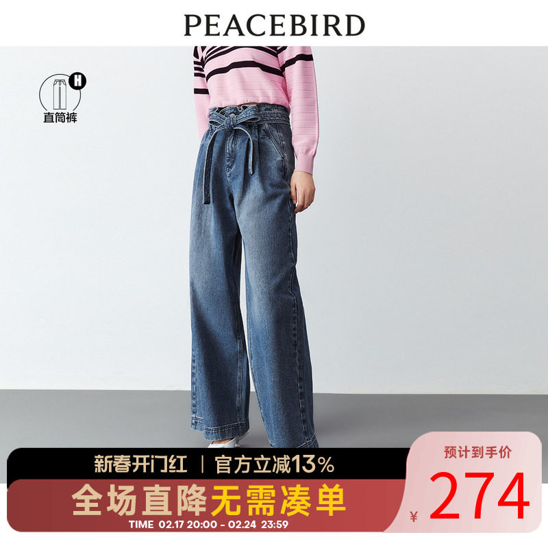 太平鸟女装高腰直筒牛仔裤阔腿裤春宽松显瘦系带牛仔裤 A8HAD1309
