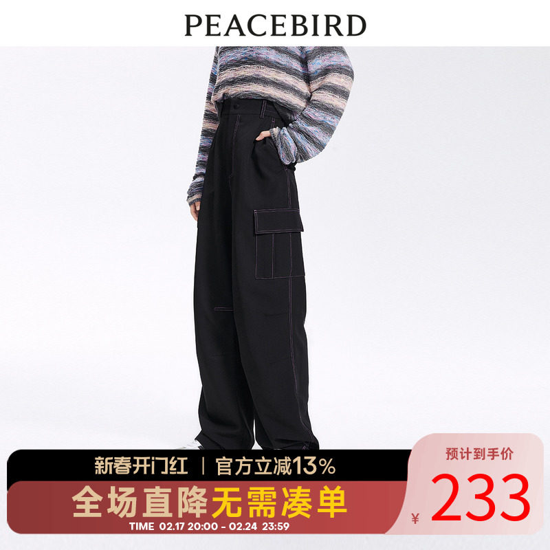 太平鸟女装撞色工装裤23年夏季宽松直筒黑色美式工装裤A7GBD3105