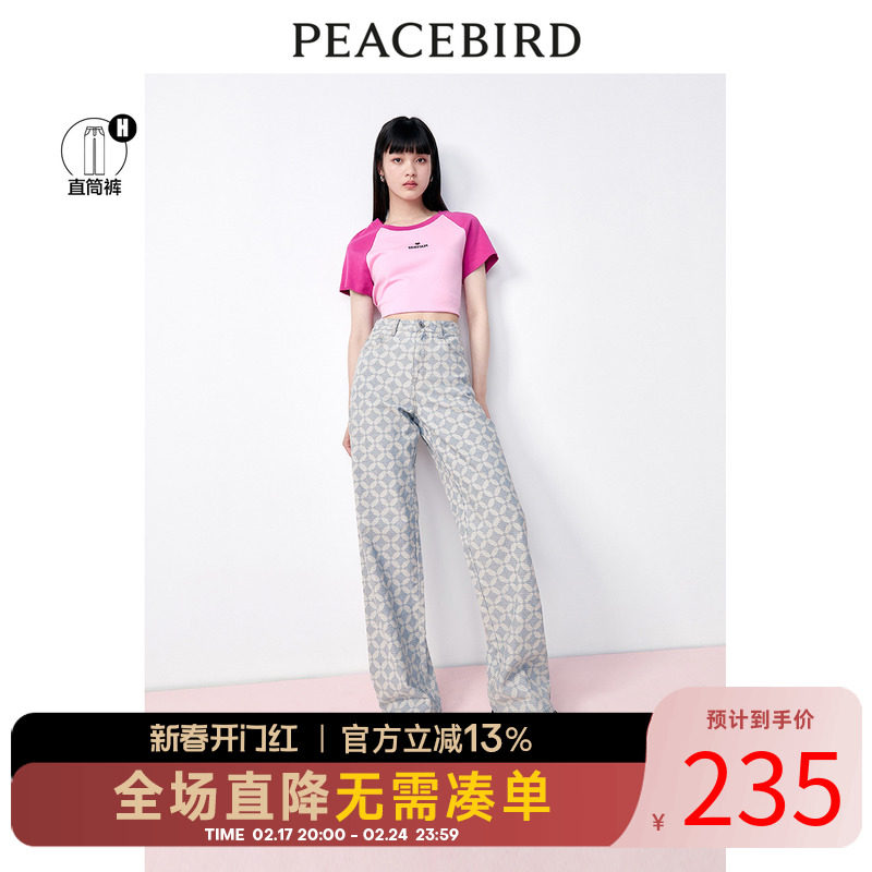 太平鸟女装复古高腰直筒牛仔裤23年夏几何印花阔腿裤子A7HAD2203