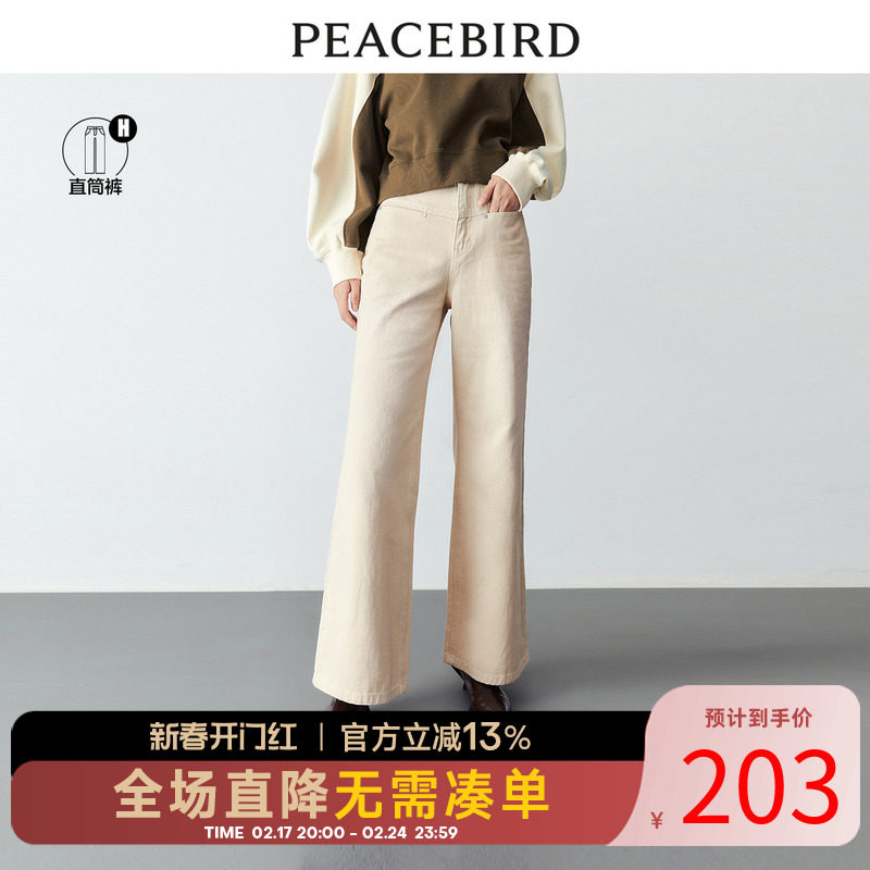 太平鸟女装复古直筒牛仔裤冬新款水洗原牛色高腰阔腿裤AWHAD1A03