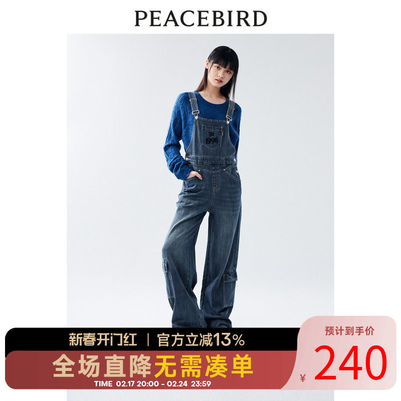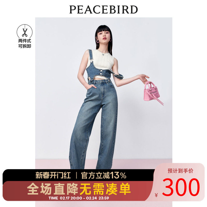 太平鸟女装工装牛仔背带裤23年夏宽松直筒阔腿牛仔裤子A7HAD3303