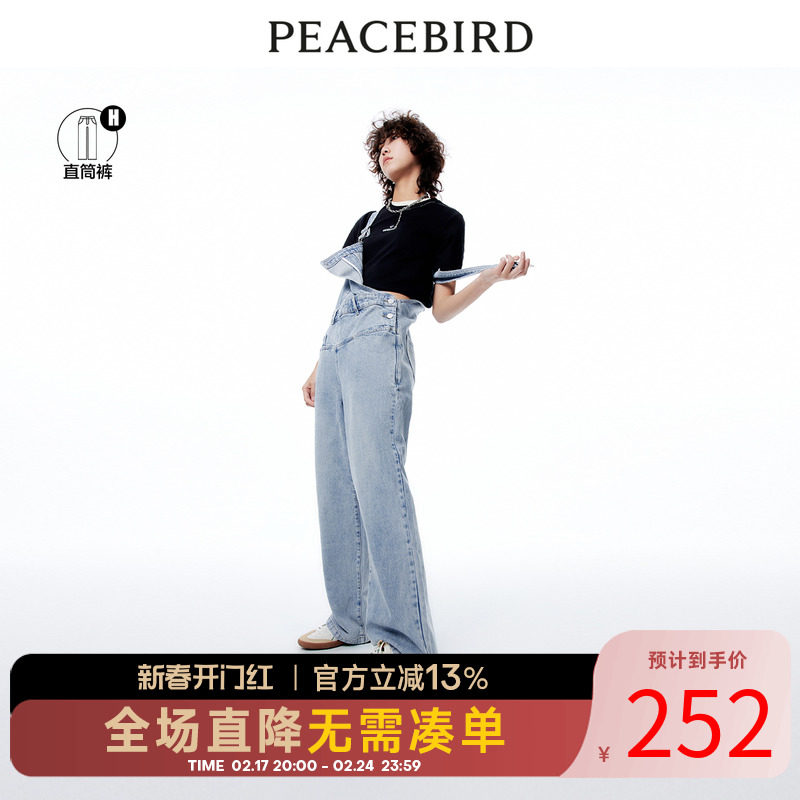 太平鸟女装高腰直筒背带牛仔裤2023春季宽松阔腿牛仔裤A8FBD1307