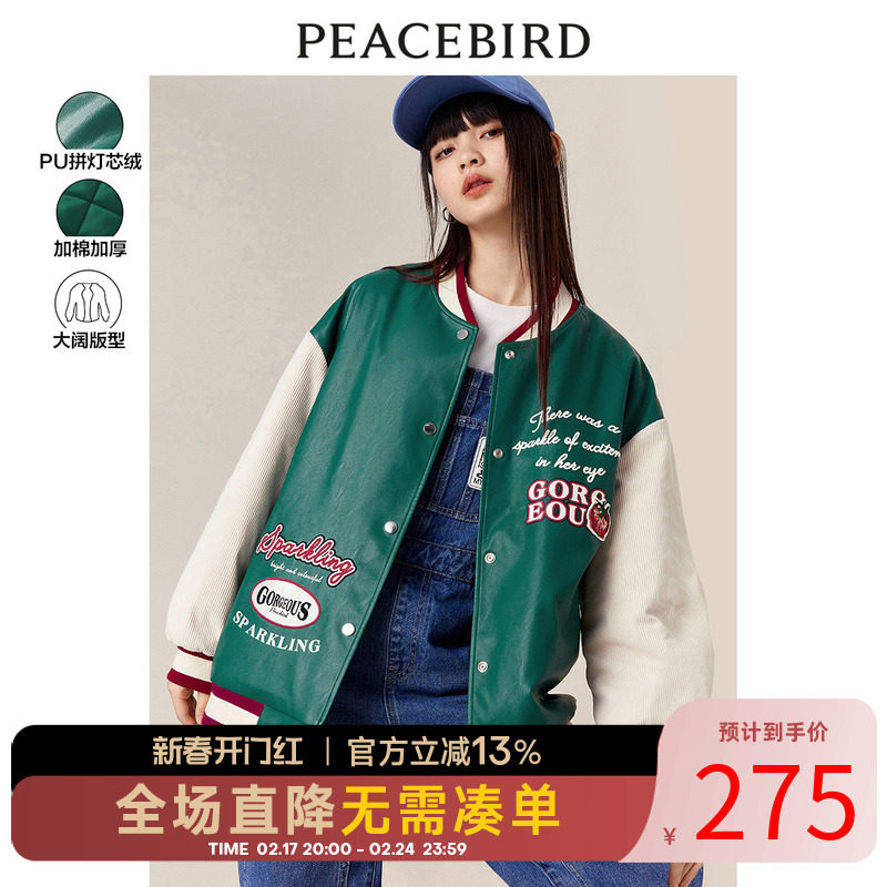 太平鸟撞色PU棒球外套女加厚秋冬外套夹棉美式复古设计AWBBC4231