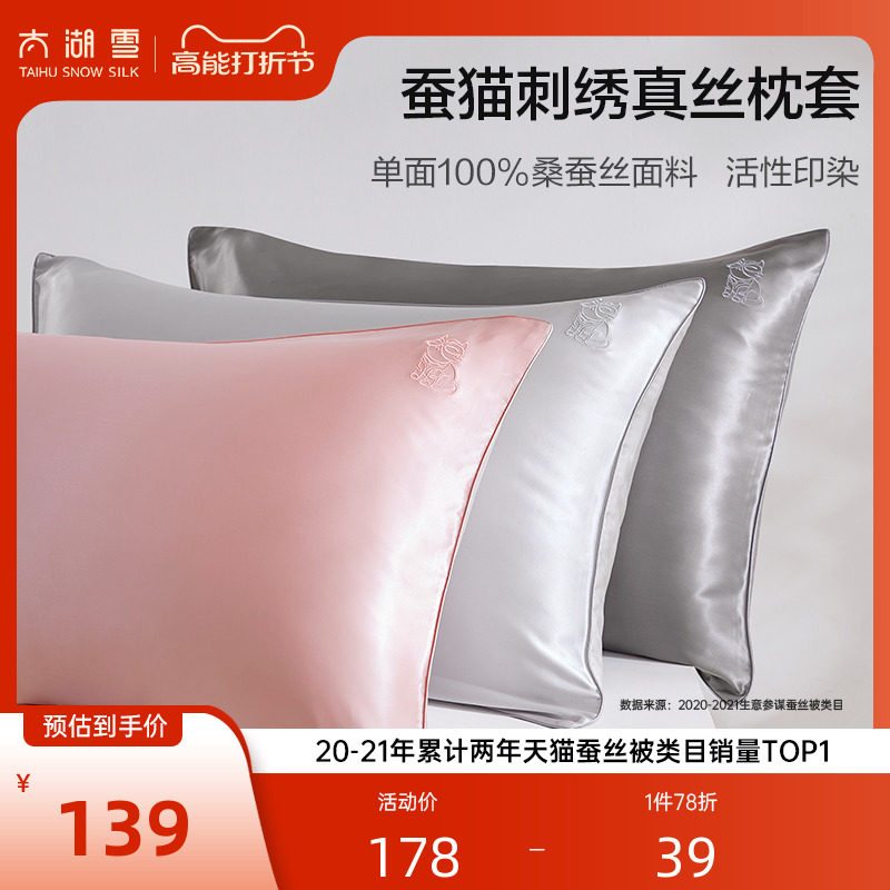 太湖雪桑蚕丝真丝枕套单面19姆米刺绣枕芯套丝绸蚕猫枕头套一只装