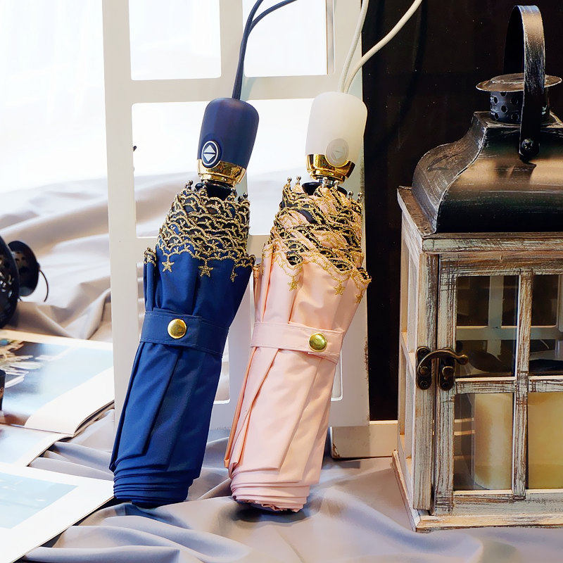 星星刺绣黑胶太阳伞折叠全自动雨伞女晴雨两用防晒防紫外线遮阳伞