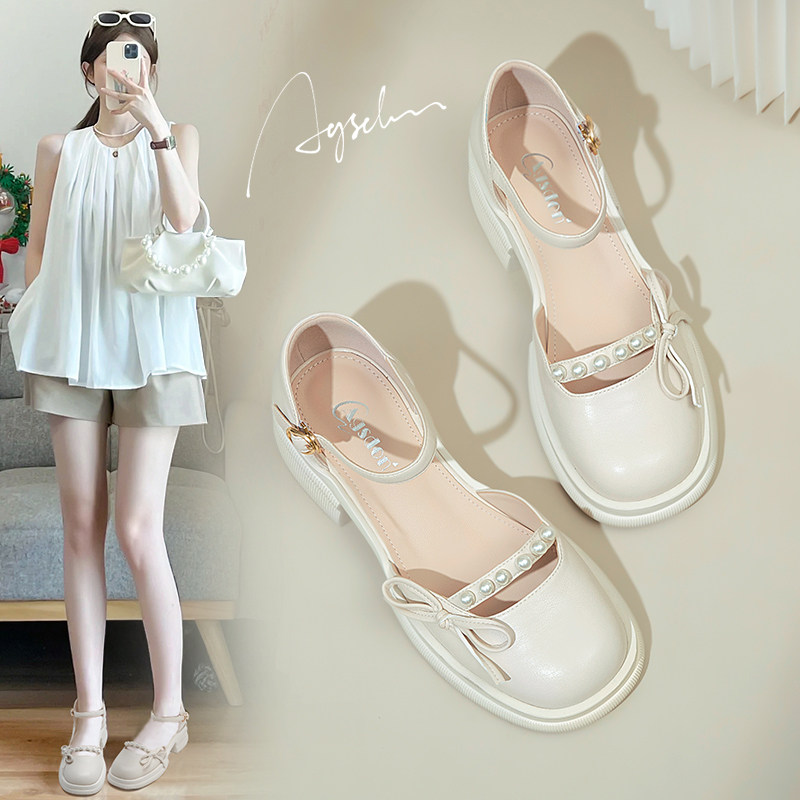 奥古狮登玛丽珍鞋女2023新款复古圆头珍珠小皮鞋厚底夏季凉鞋单鞋