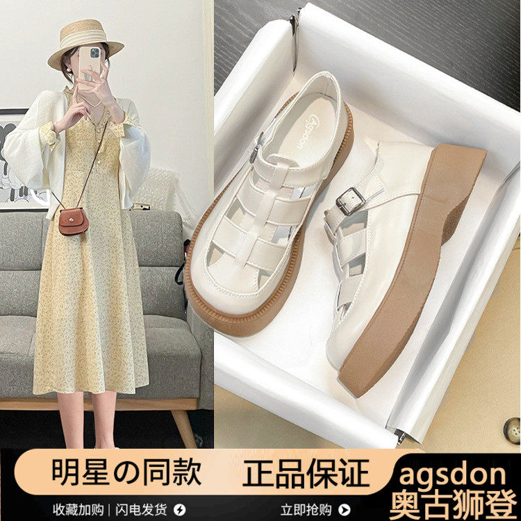 奥古狮登真皮罗马凉鞋女2023年新款夏季仙女风配裙子法式包头镂空
