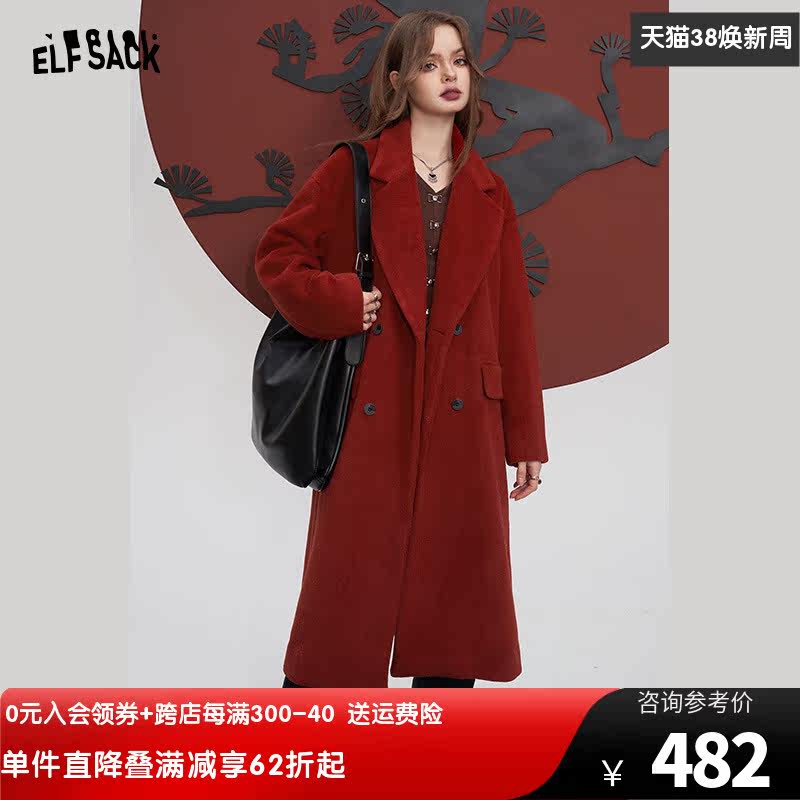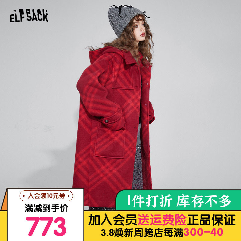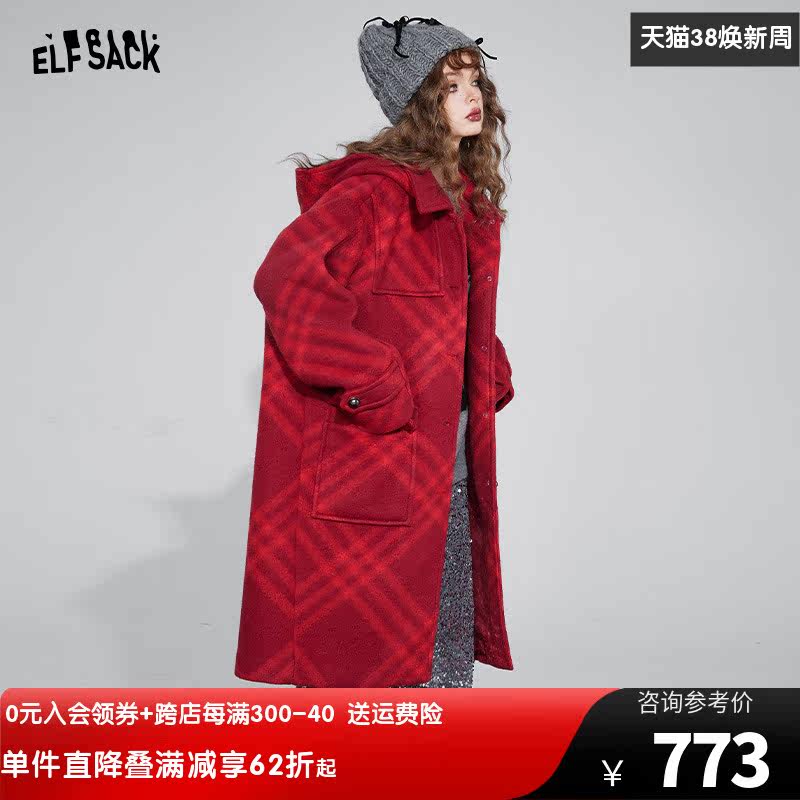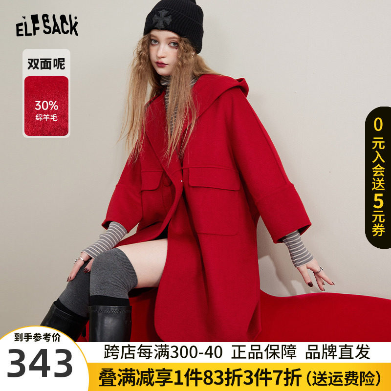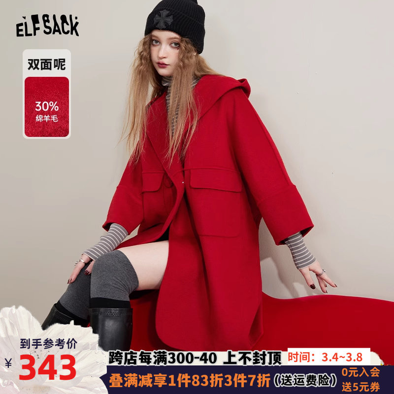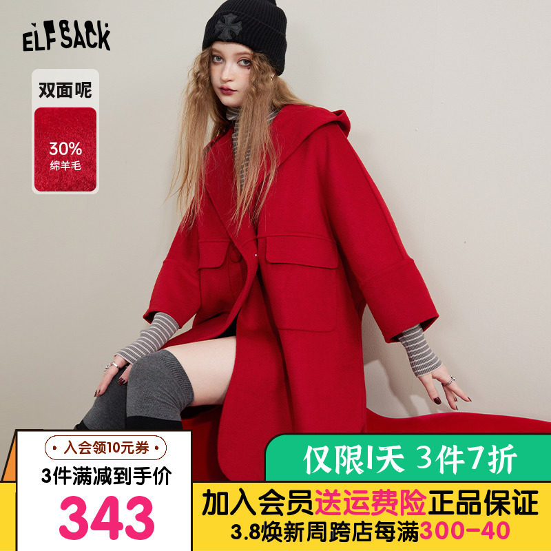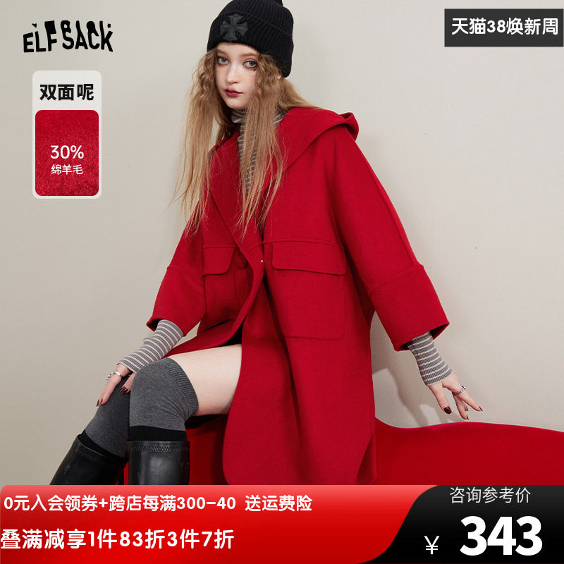 妖精的口袋红色圣诞毛呢外套女2023冬季毛新款连帽中长款呢大衣