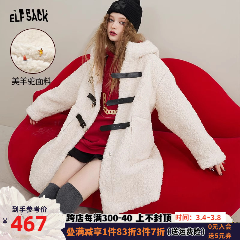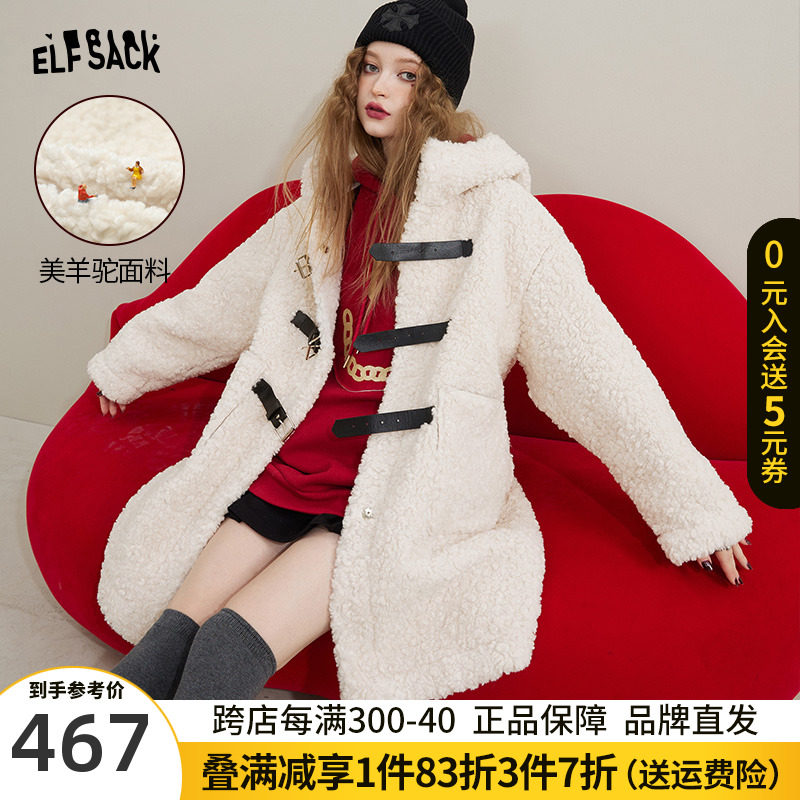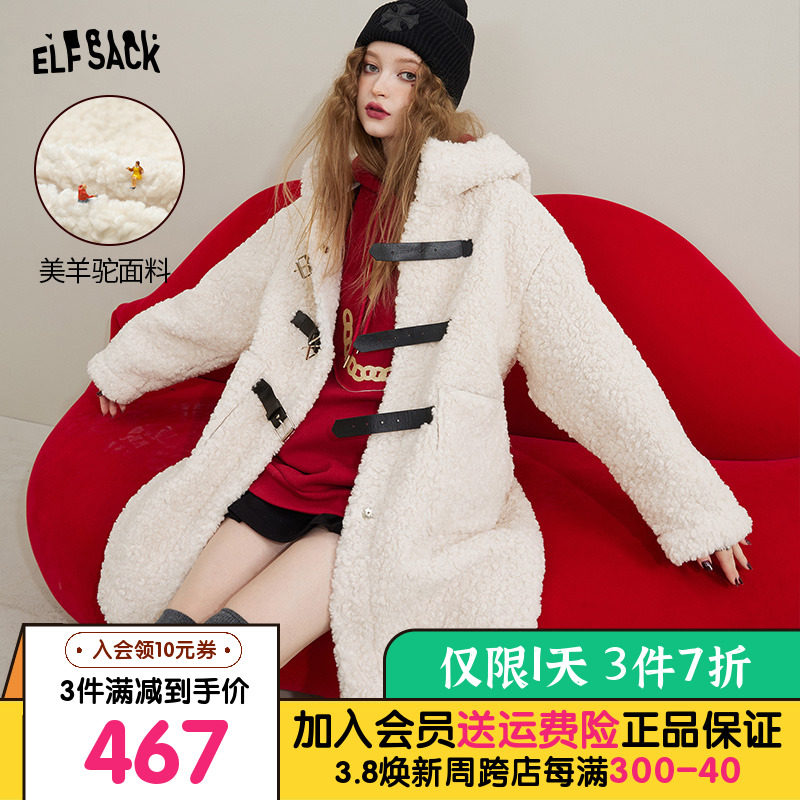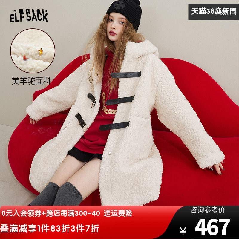 妖精的口袋连帽白色仿羊羔绒大衣女2023秋冬季新款加厚中长款外套