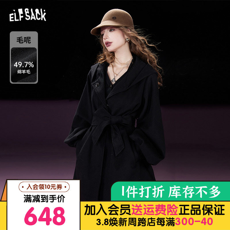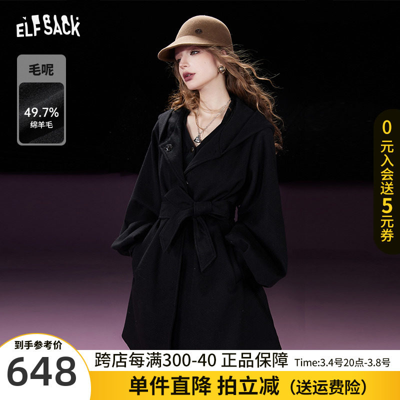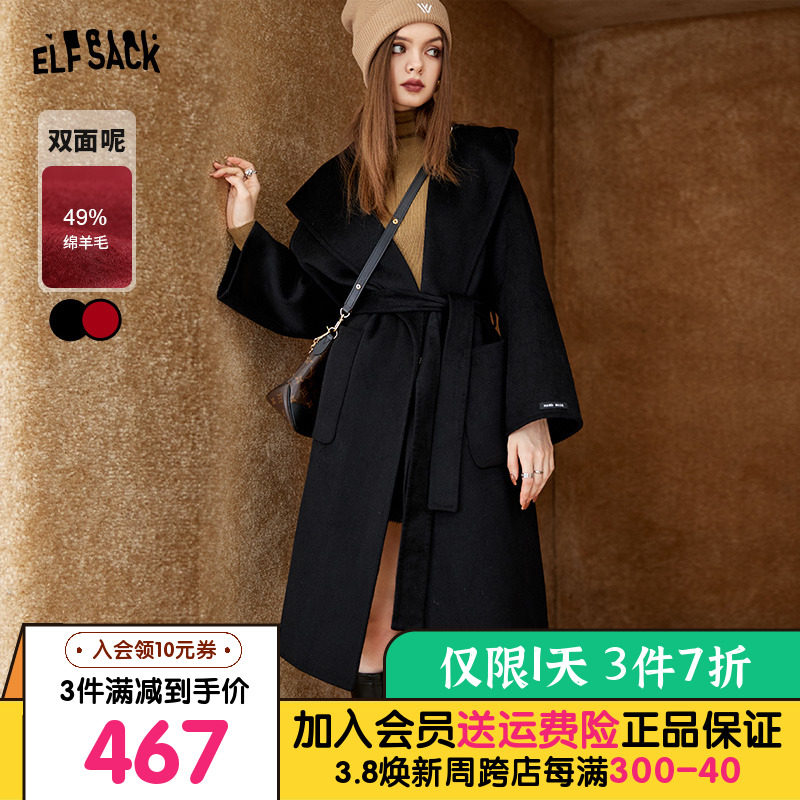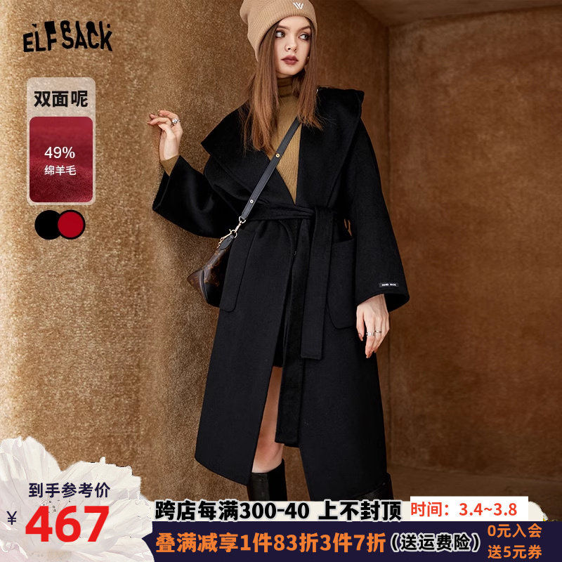 妖精的口袋连帽黑色双面呢大衣女2022秋冬新款毛呢外套气质中长款