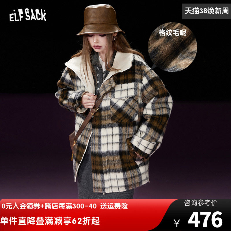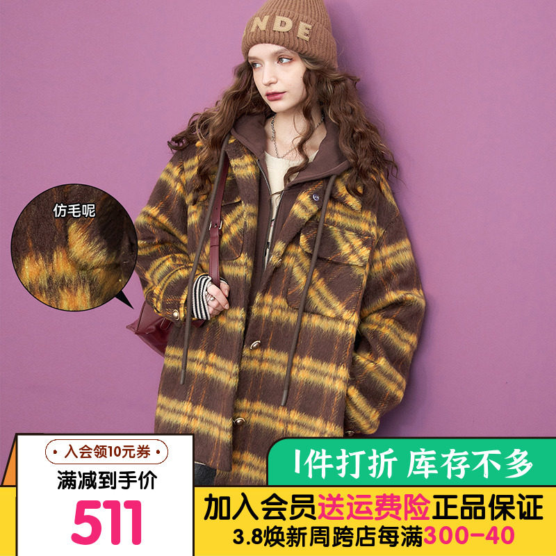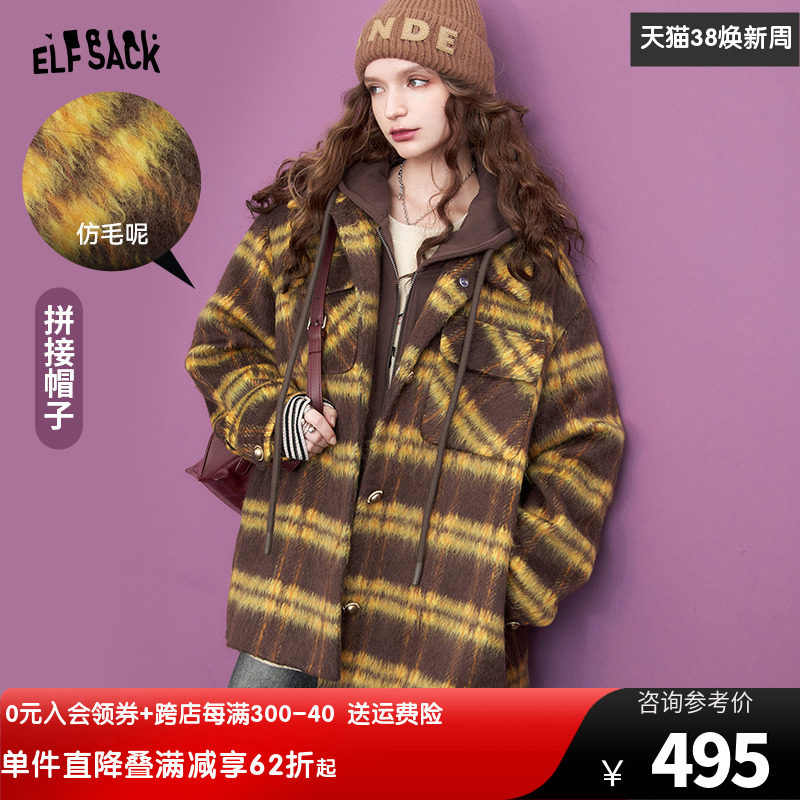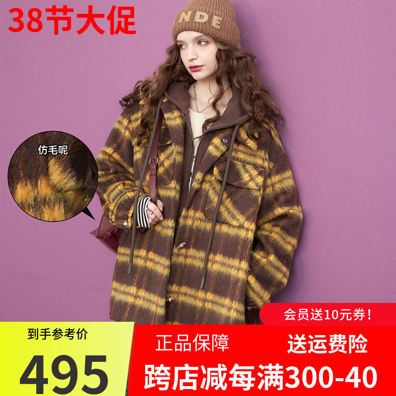 妖精的口袋复古格纹仿毛呢大衣女2023冬季新款连帽拼接学院风外套