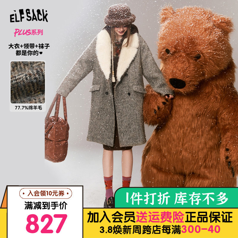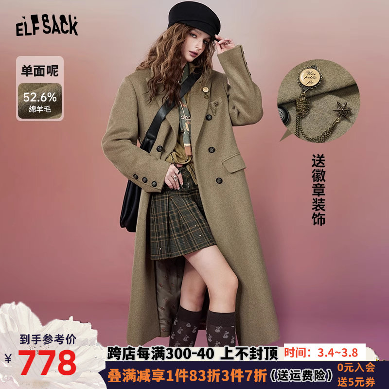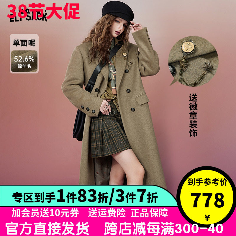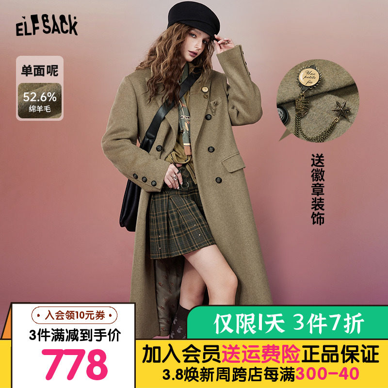 妖精的口袋中长款毛呢外套女2023冬季新款宽松气质双排扣呢大衣