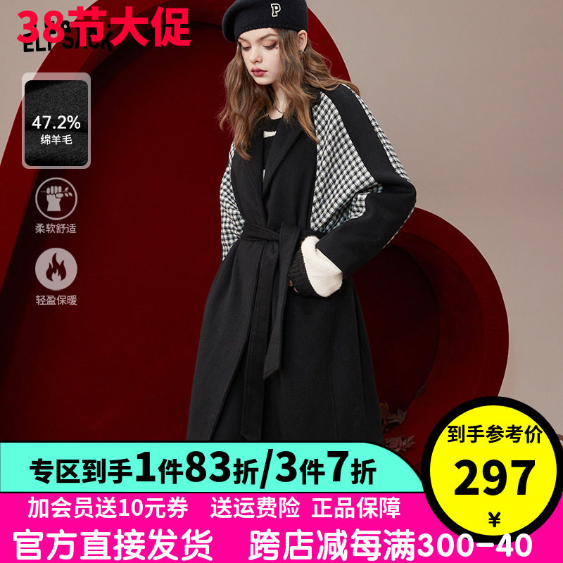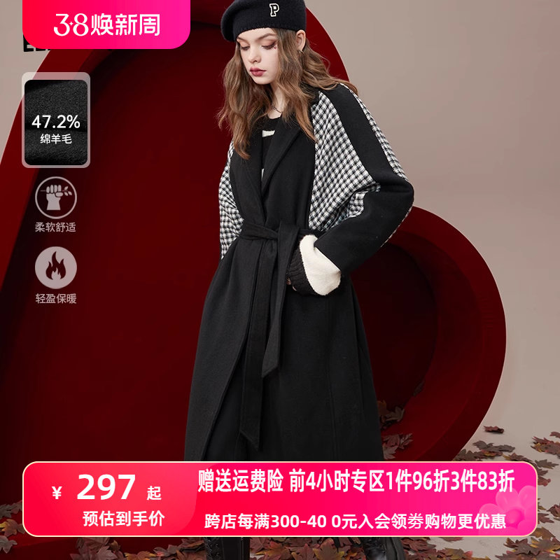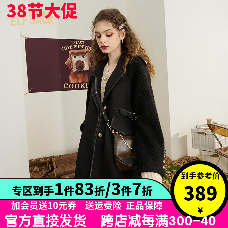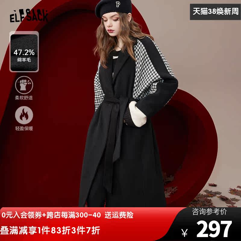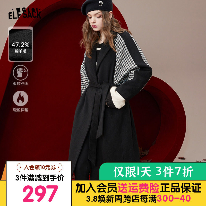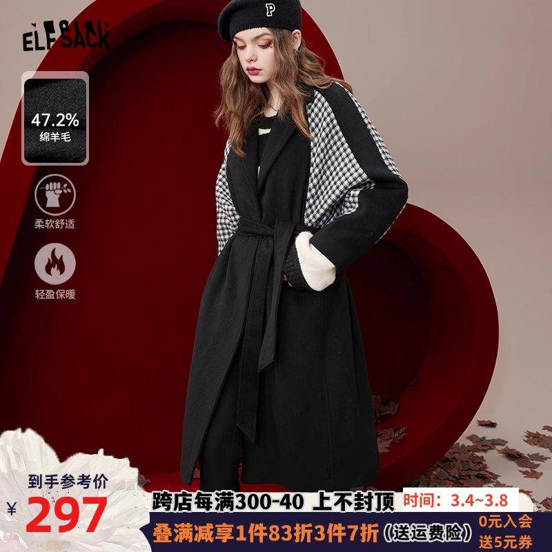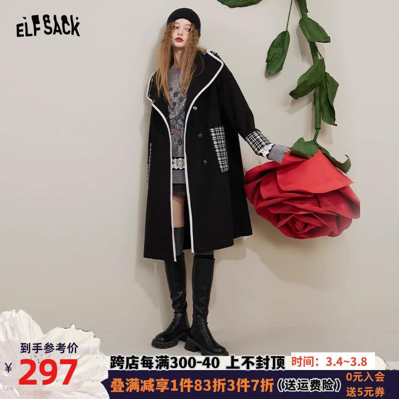 妖精的口袋千鸟格拼接黑色大衣外套女2022秋冬季新款设计感中长款