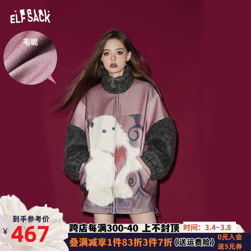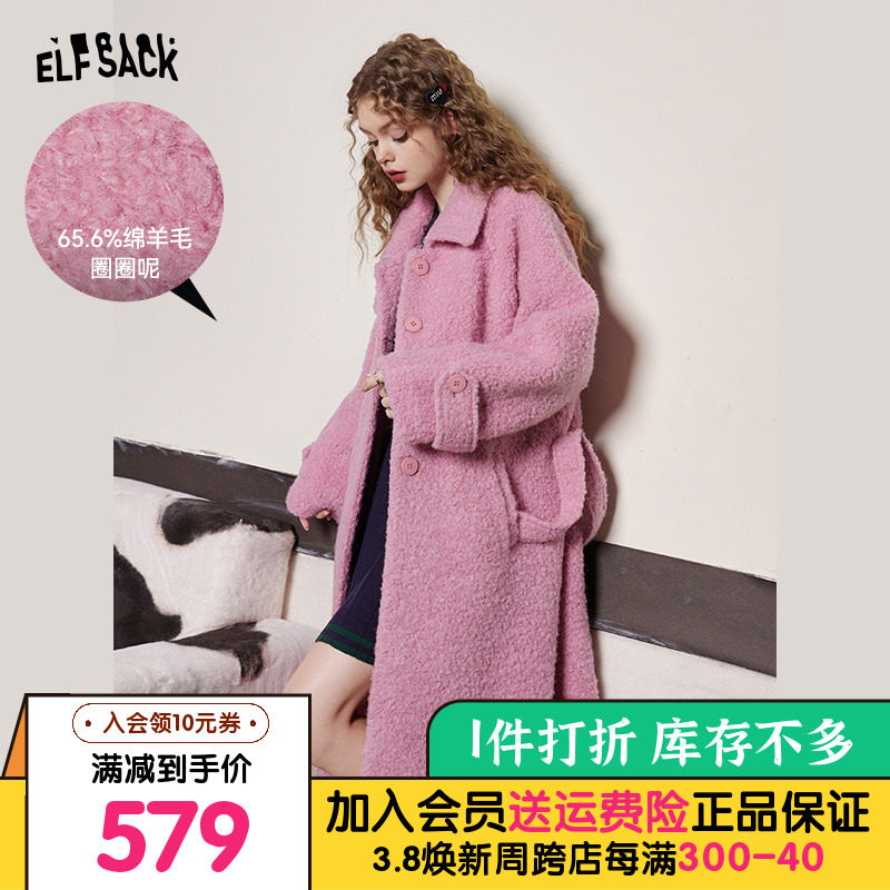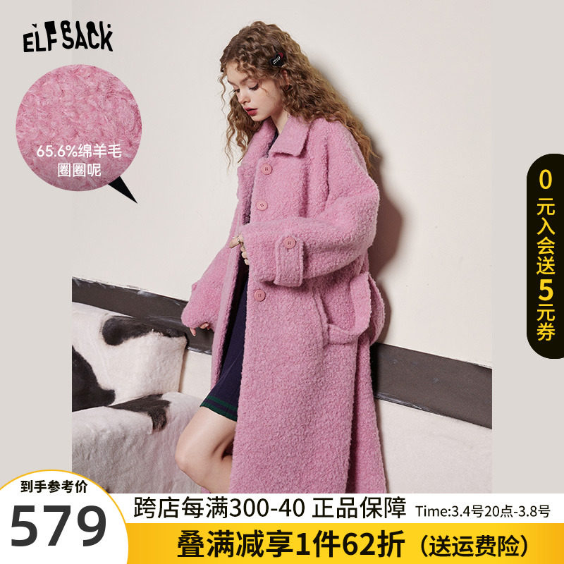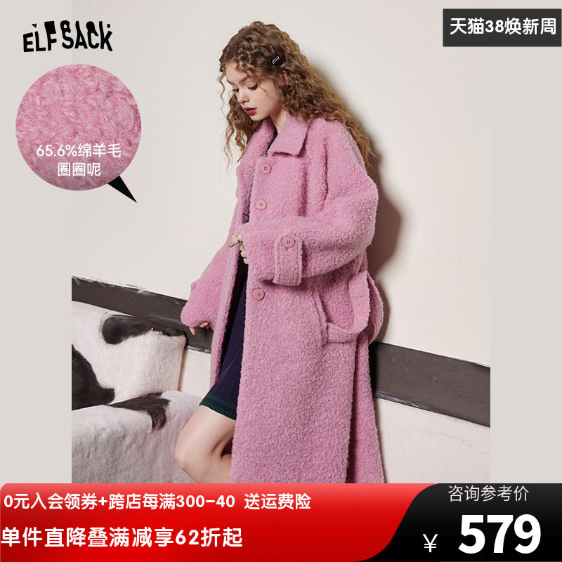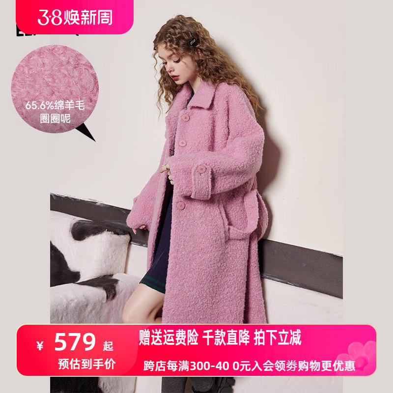 妖精的口袋粉色中长款大衣女2023冬季新款宽松慵懒风甜美毛呢外套