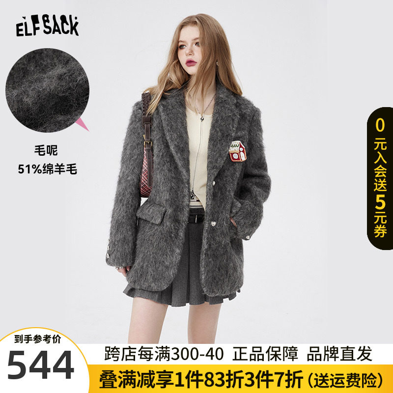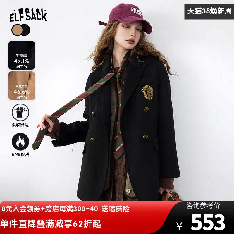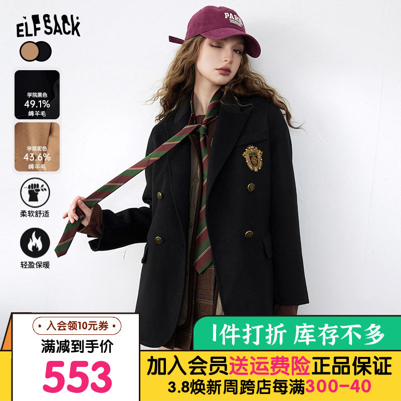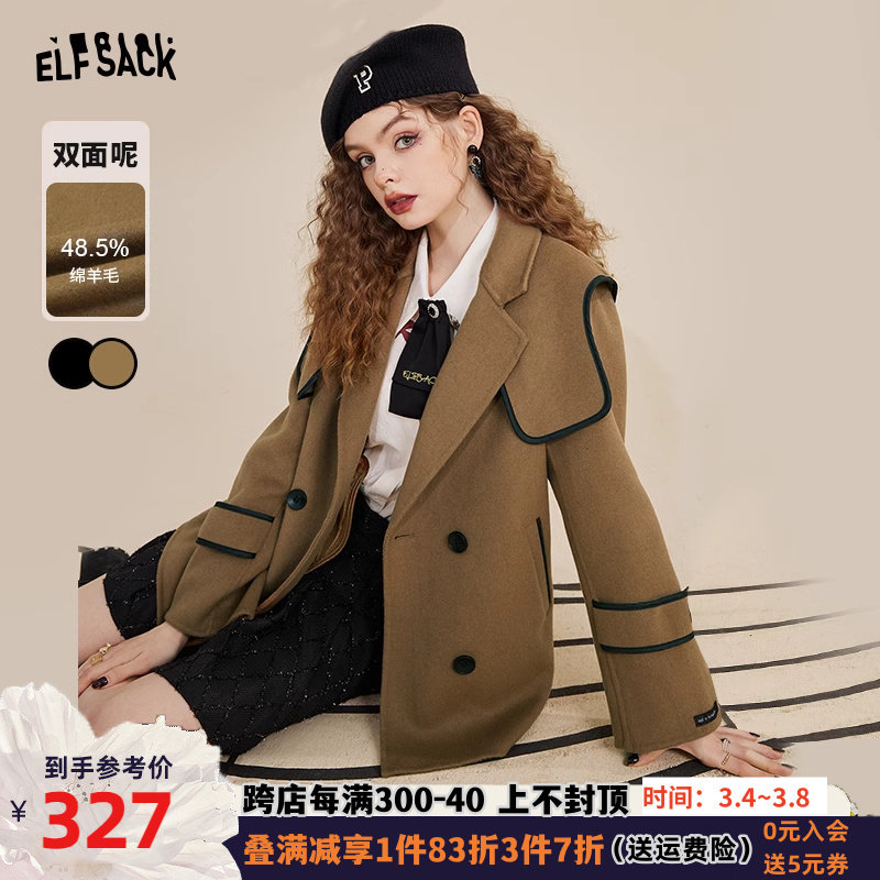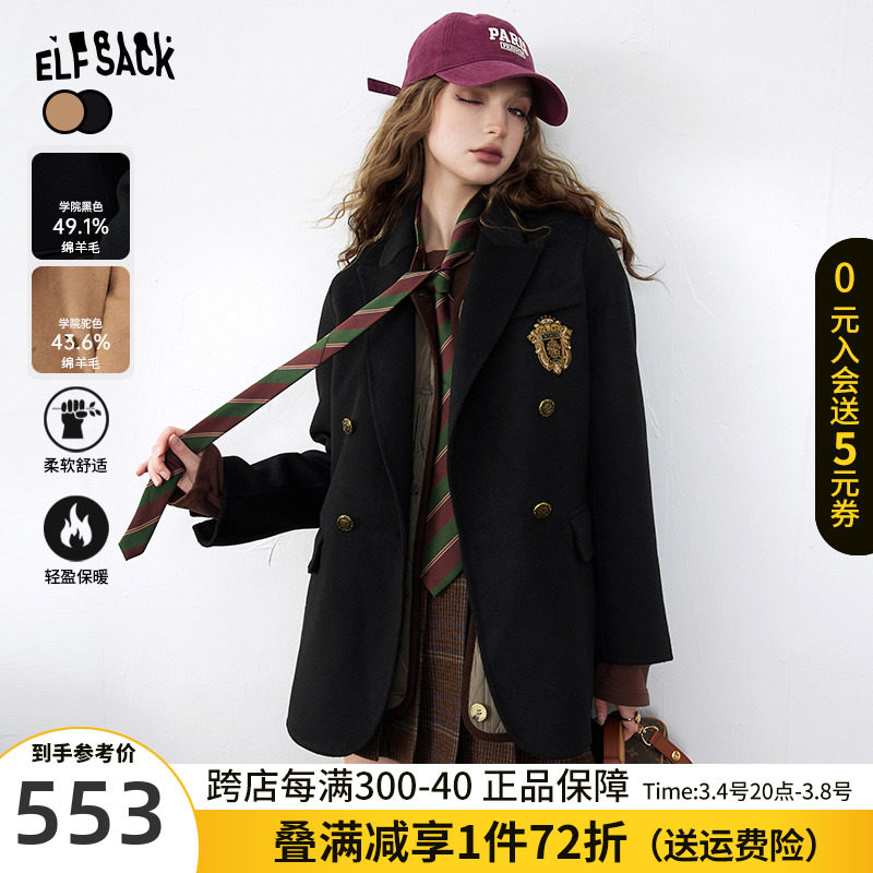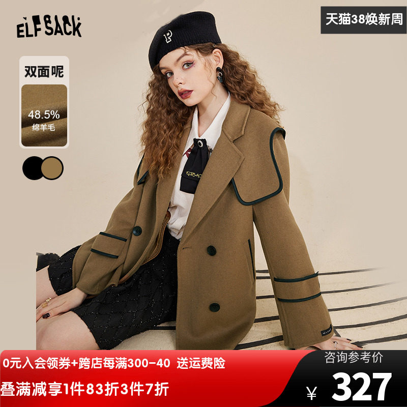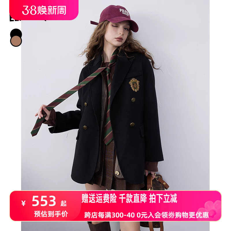 妖精的口袋双面呢西装羊毛呢外套女2023冬季美拉德学院风黑色大衣