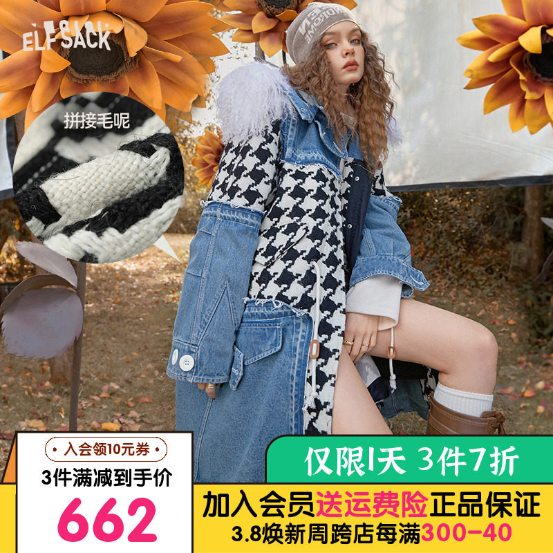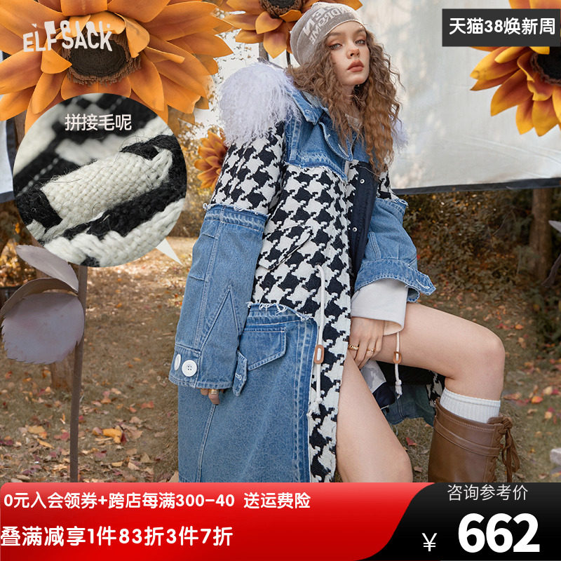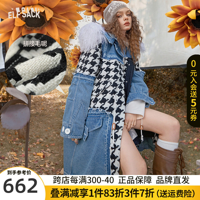 妖精的口袋牛仔拼接千鸟格毛呢大衣女2022秋冬新款设计感呢子外套