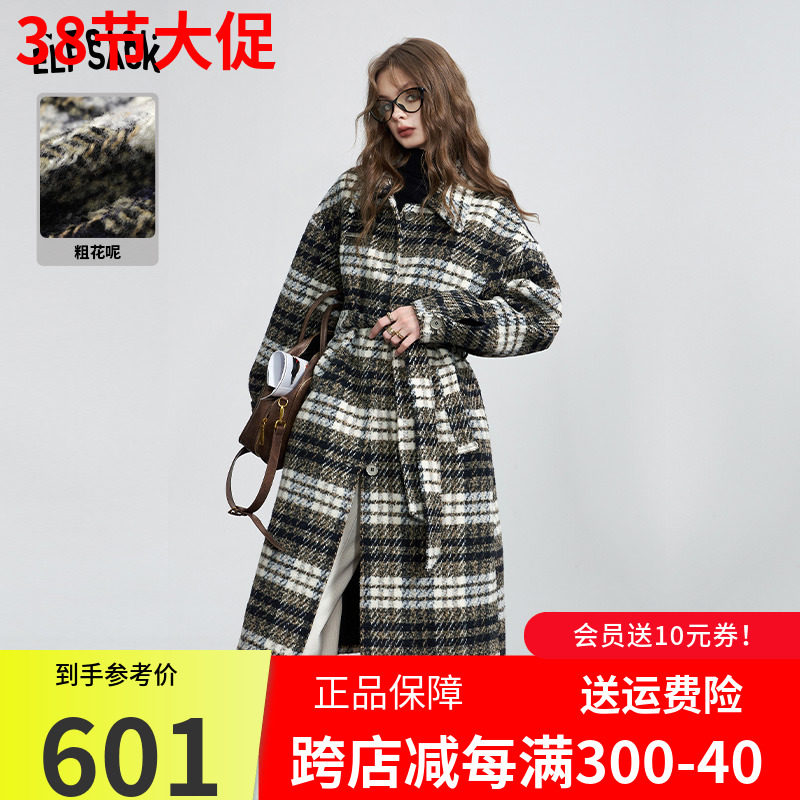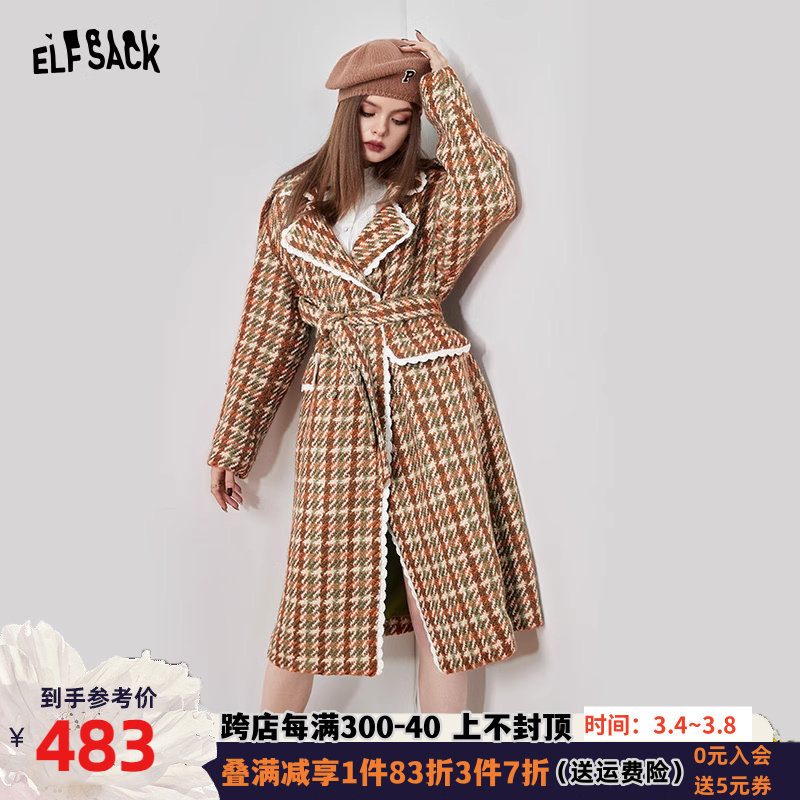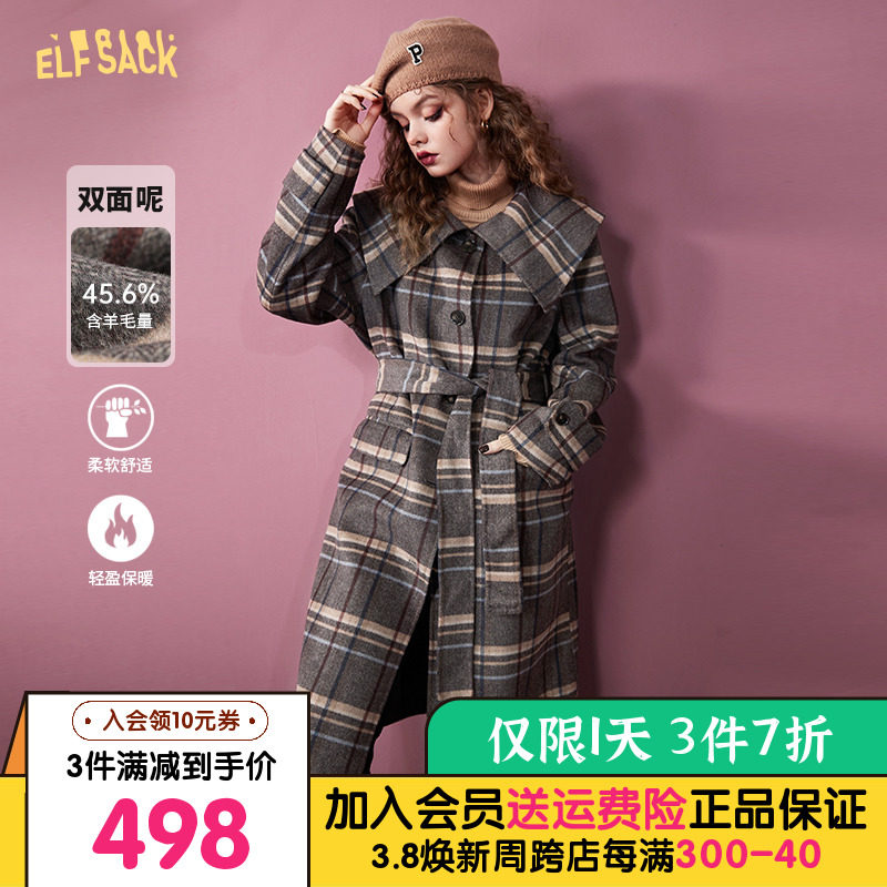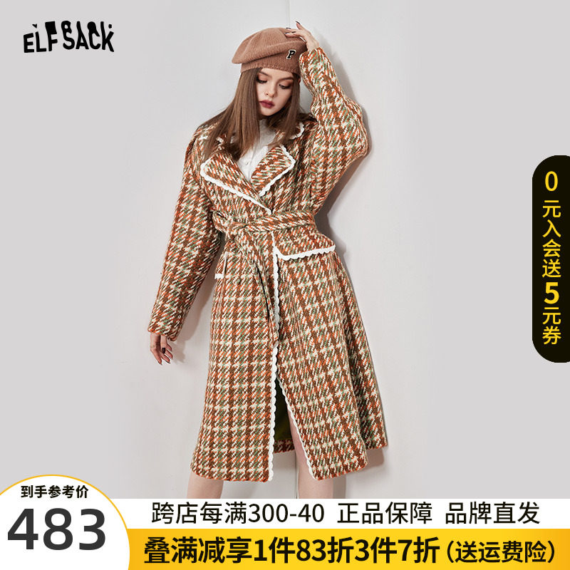 妖精的口袋翻领格纹毛呢大衣女2022秋冬新款复古加厚长款呢子外套