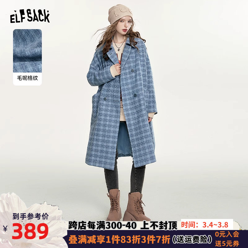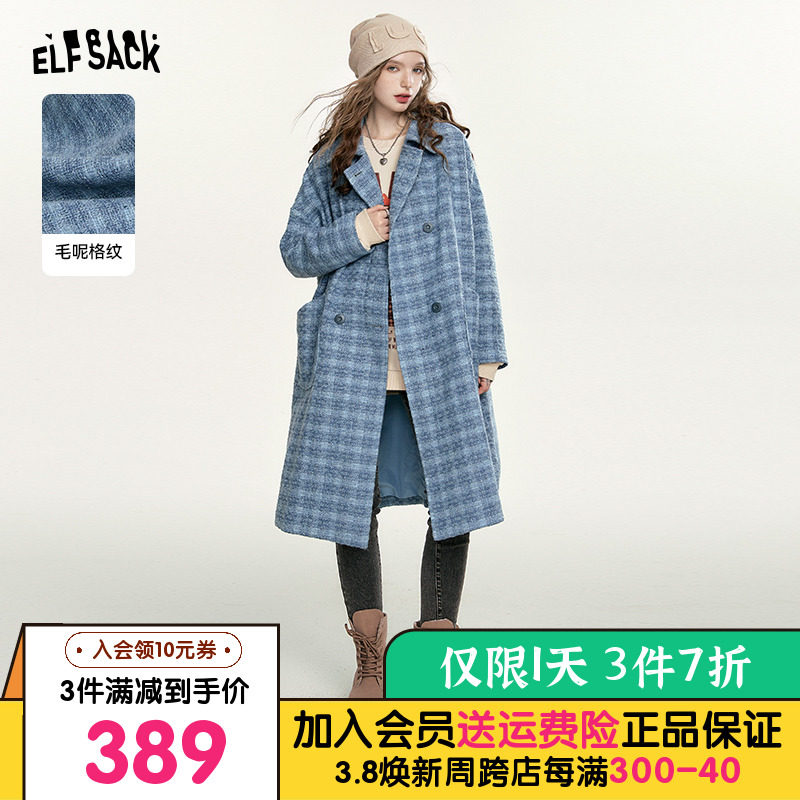 妖精的口袋格子毛呢大衣女2023秋季新款小个子学院风蓝色长款外套