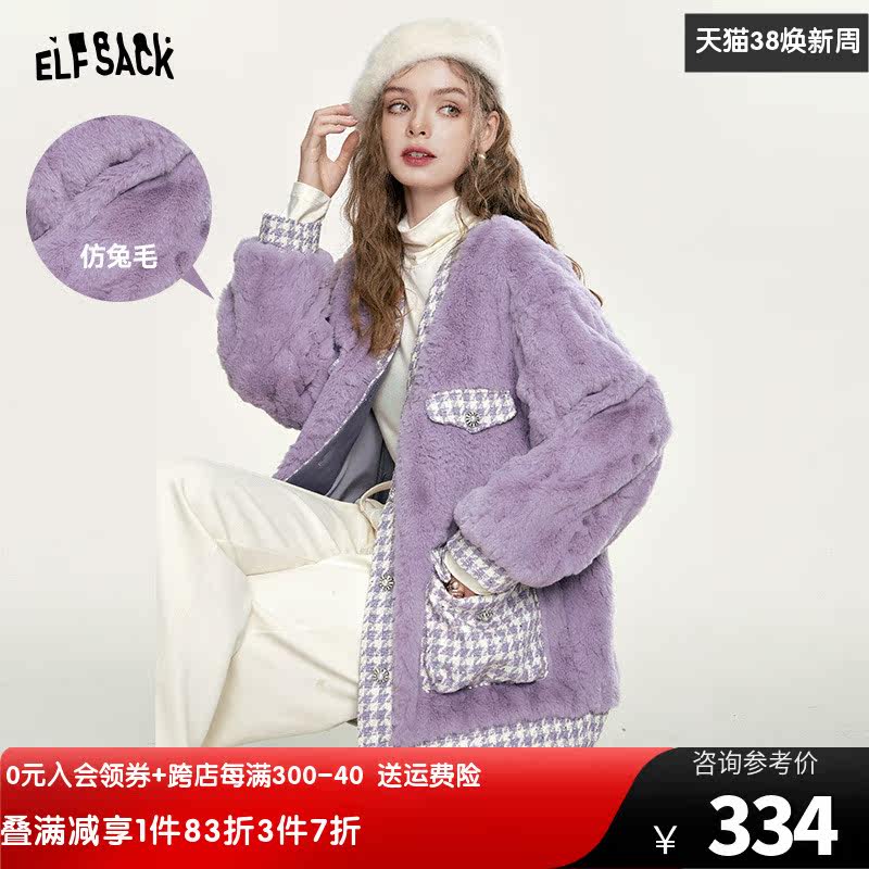 妖精的口袋拼接毛绒粗花呢外套女2024春秋新款v领慵懒风开衫大衣