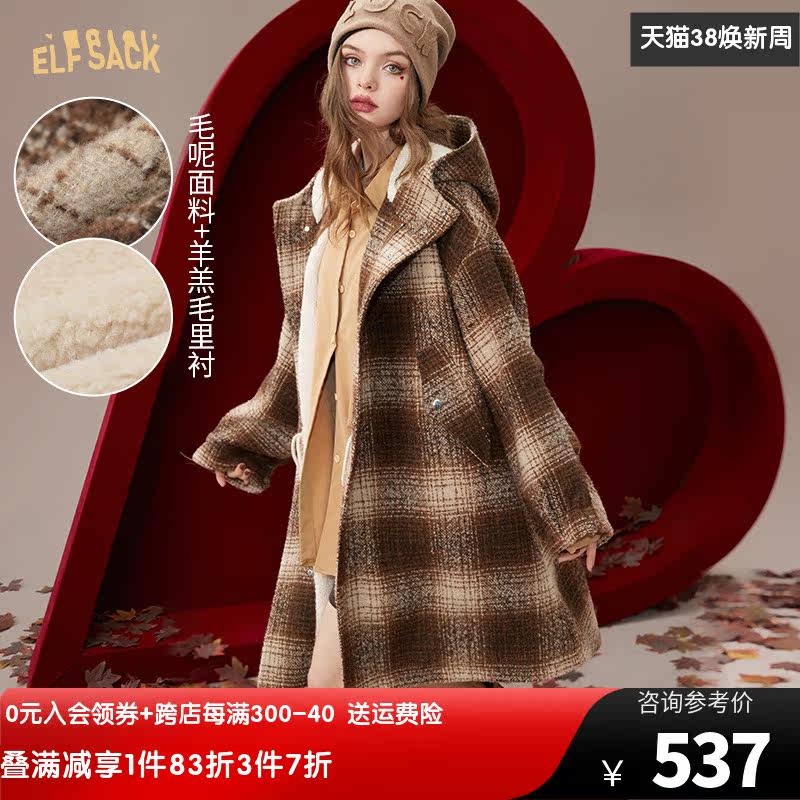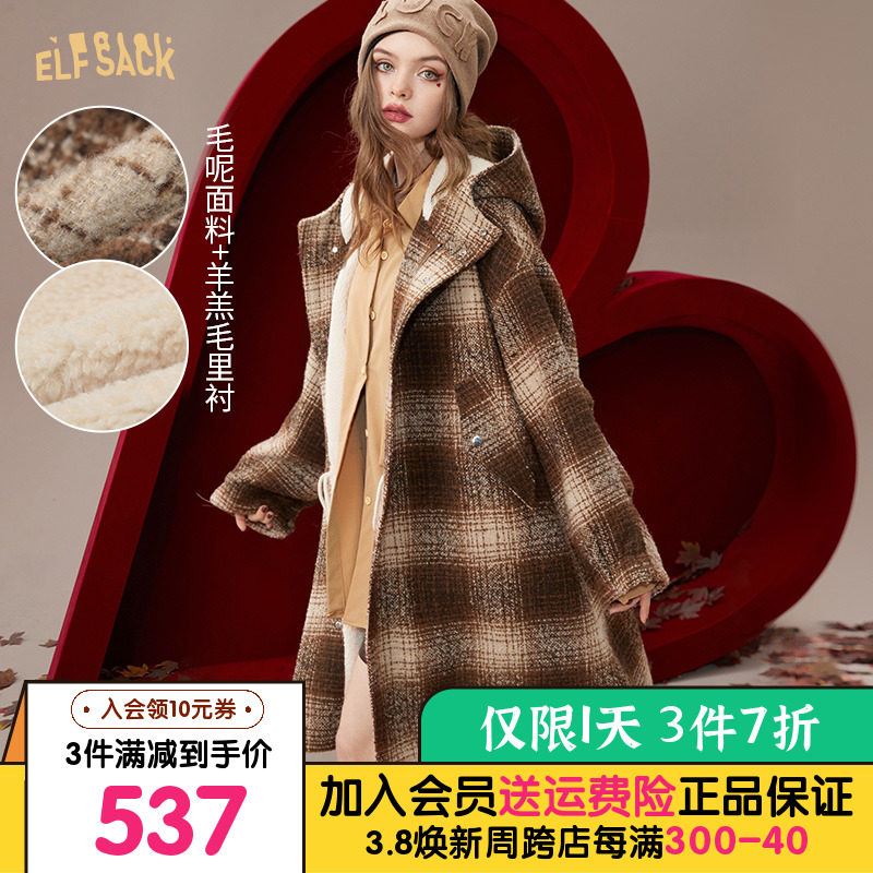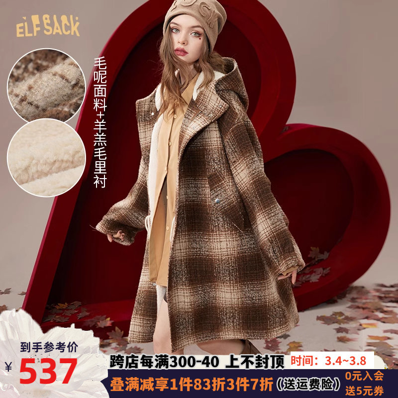 妖精的口袋连帽复古格纹大衣女2023秋冬新款中长款小个子毛呢外套