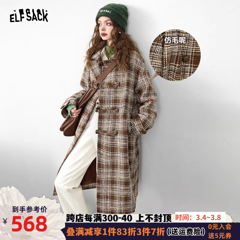 妖精的口袋咖色格纹仿毛呢大衣女2023冬季新款拼接长款学院风外套