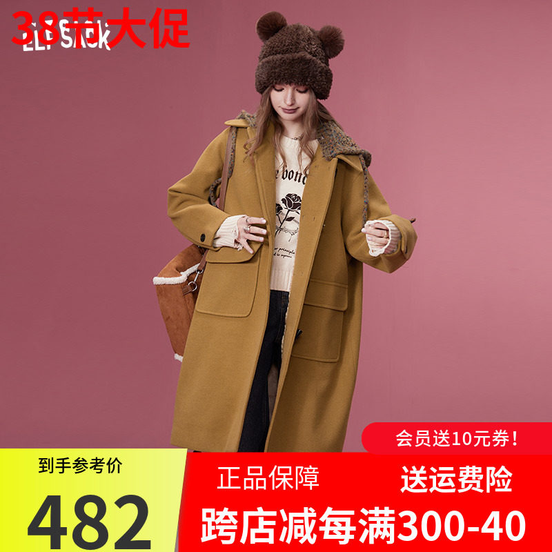 妖精的口袋中长款牛角扣毛呢外套女2023冬季新款可拆连帽呢大衣