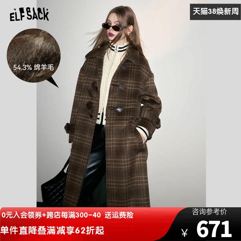 妖精的口袋牛角扣毛呢外套女2023冬季新款格子长款学院风呢大衣