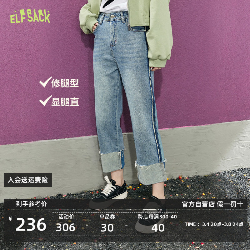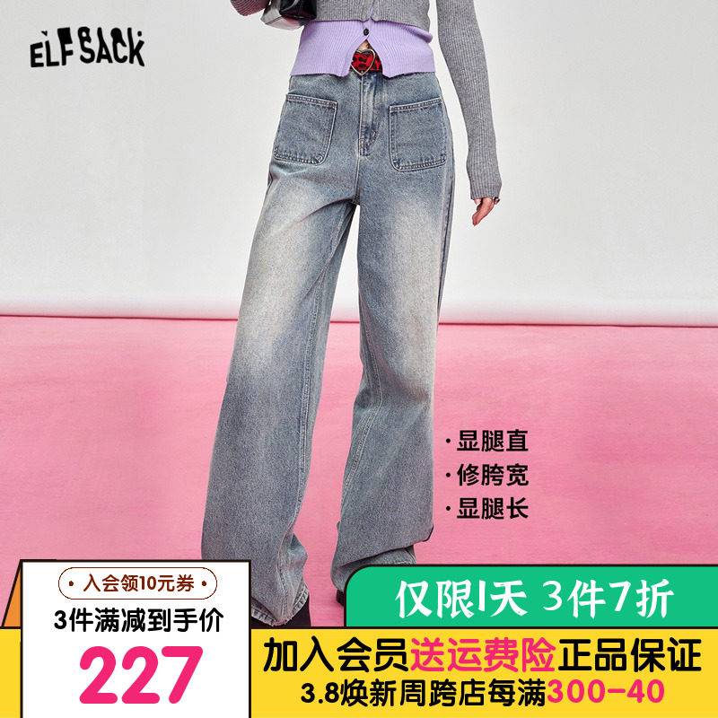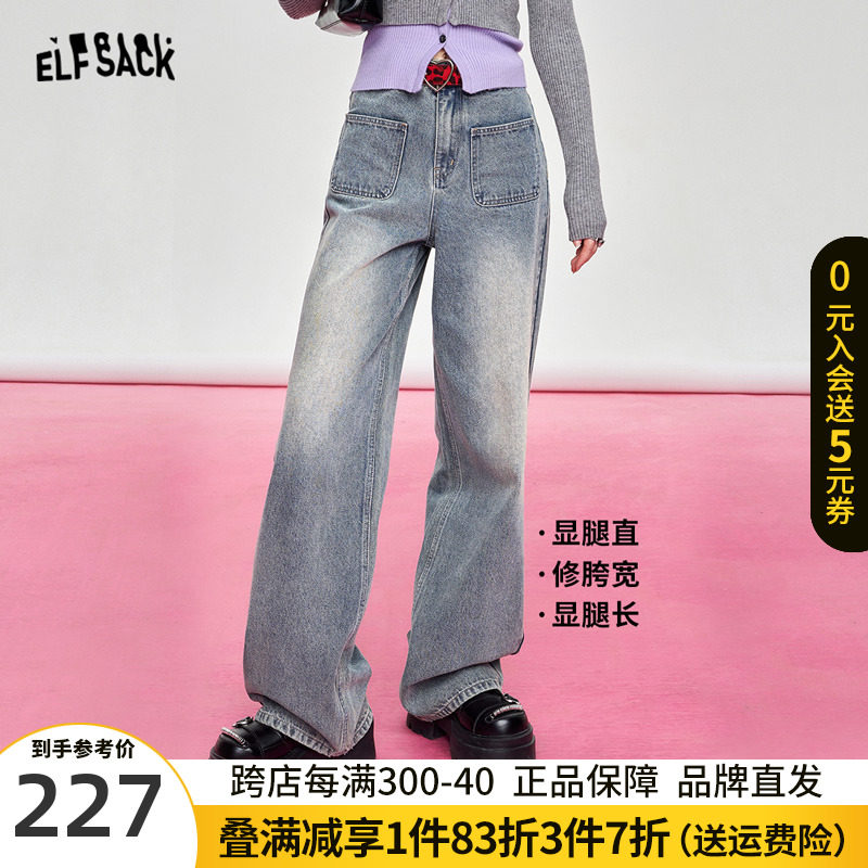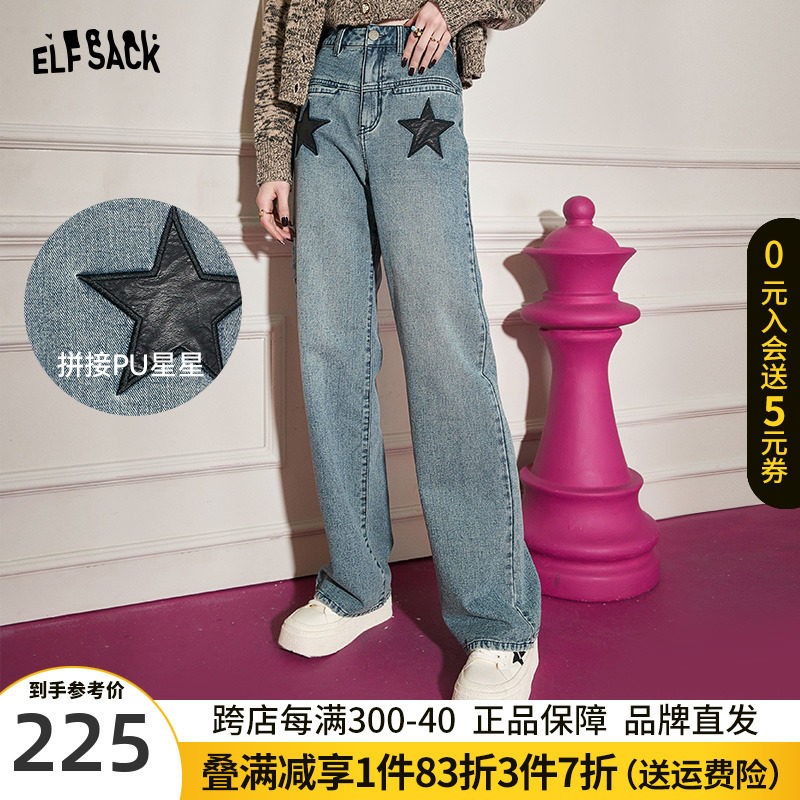 商场同款妖精的口袋高腰直筒牛仔裤女2023秋季新款拼接显瘦长裤子