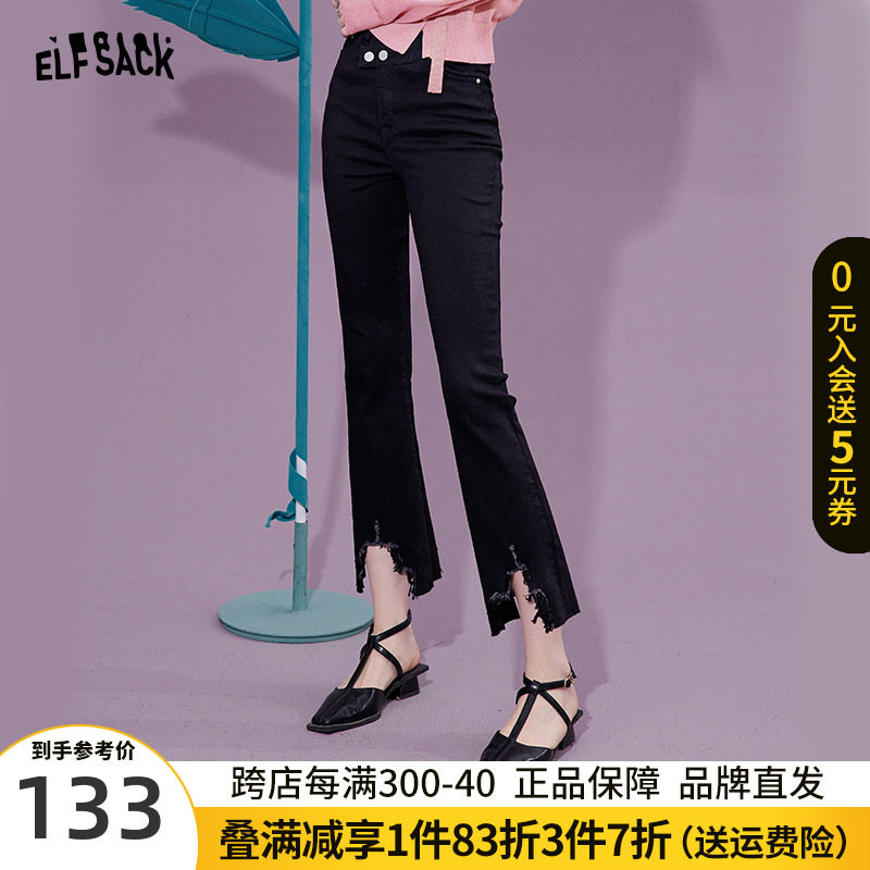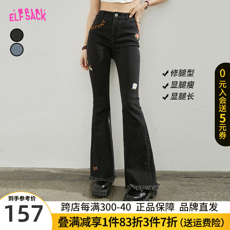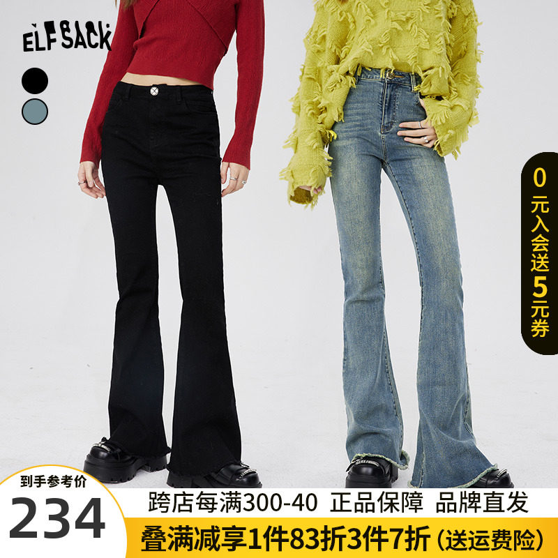 妖精的口袋毛边黑色喇叭裤女2023春秋季新款高腰显瘦微喇牛仔裤子