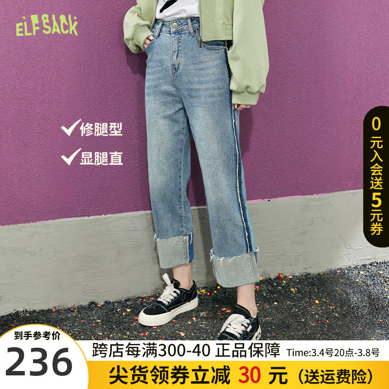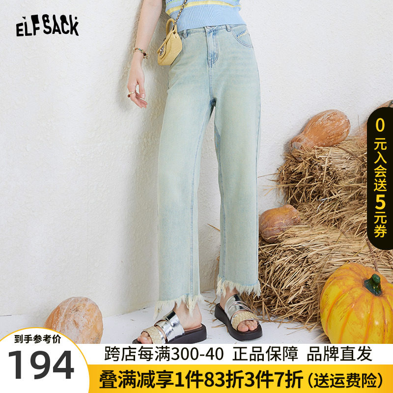 妖精的口袋高腰直筒牛仔裤女2024春夏季新款毛边显瘦阔腿九分裤子