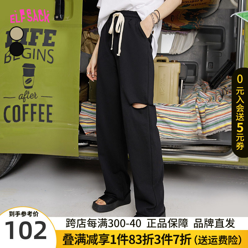 妖精的口袋破洞黑色卫裤女2023春新款宽松窄版阔腿裤运动休闲裤子