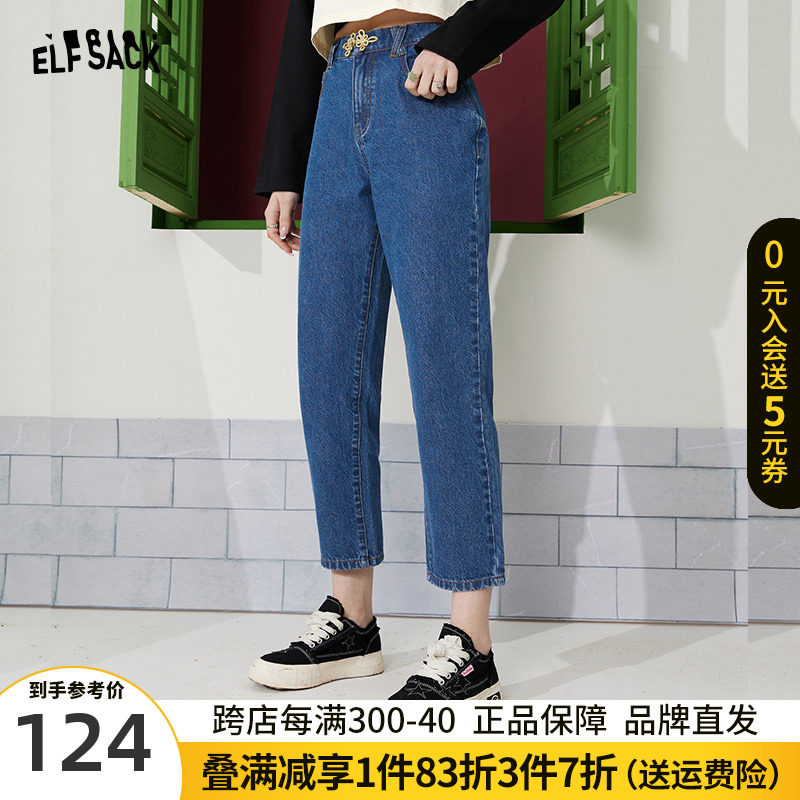 妖精的口袋盘扣蓝色萝卜裤牛仔裤女2024春季新款高腰显瘦九分裤子