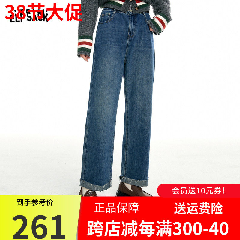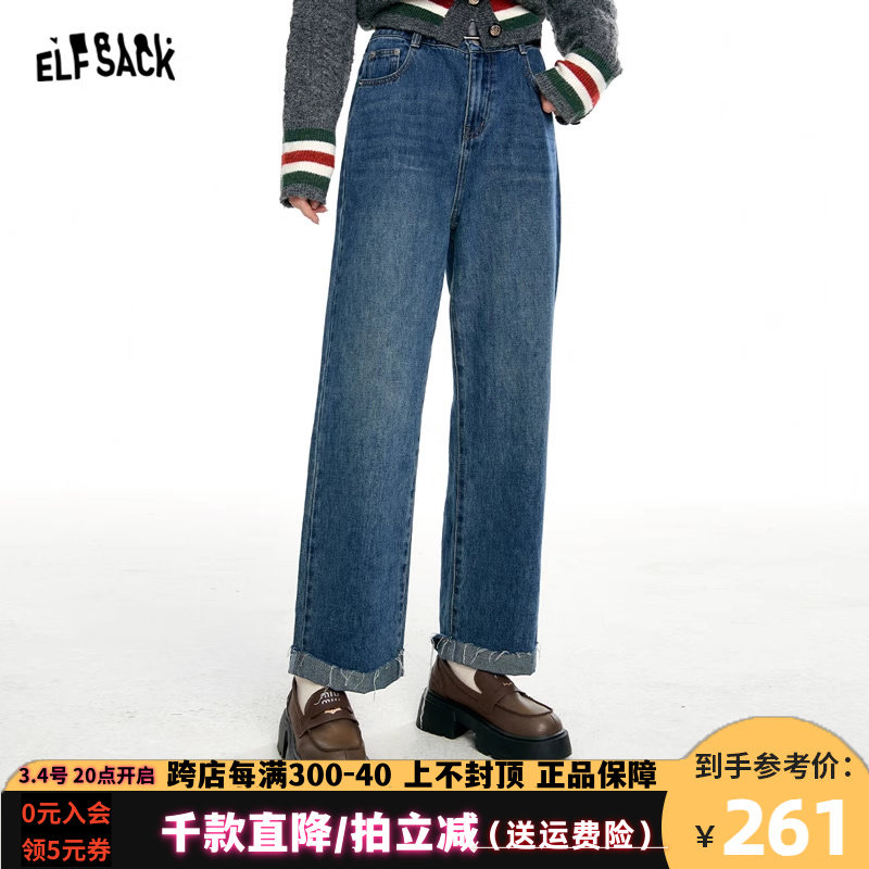 妖精的口袋翻边水洗蓝直筒牛仔裤女2024春季新款宽松阔腿高腰裤子