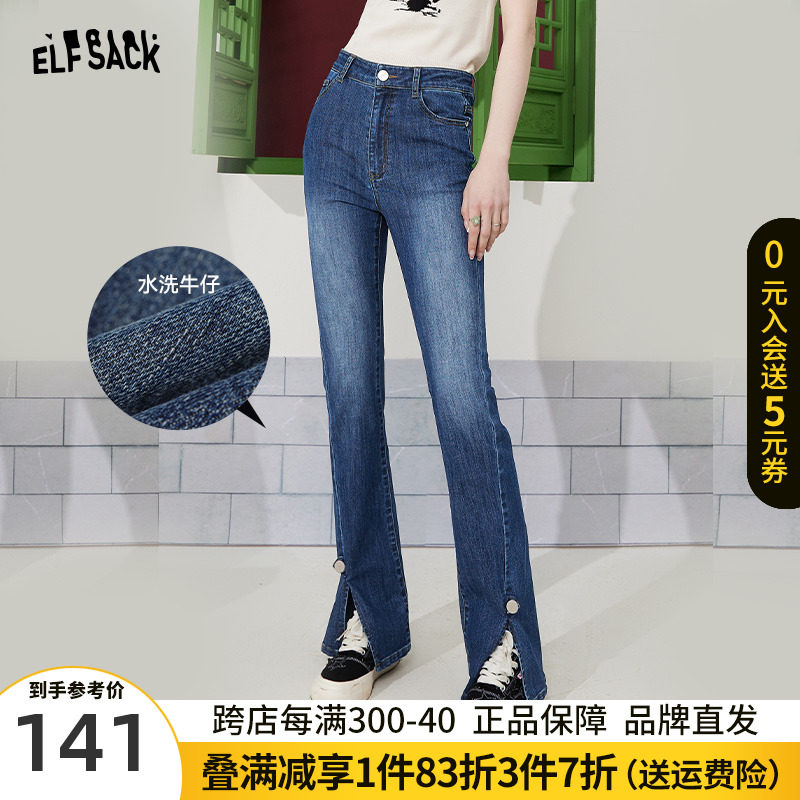 妖精的口袋蓝色修身开叉牛仔裤女2024春季新款紧身裤高腰显瘦裤子