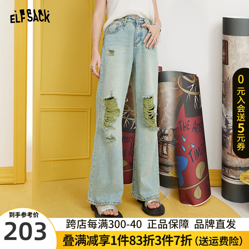 妖精的口袋复古破洞牛仔裤女2023夏季新款高腰薄款设计感直筒裤子